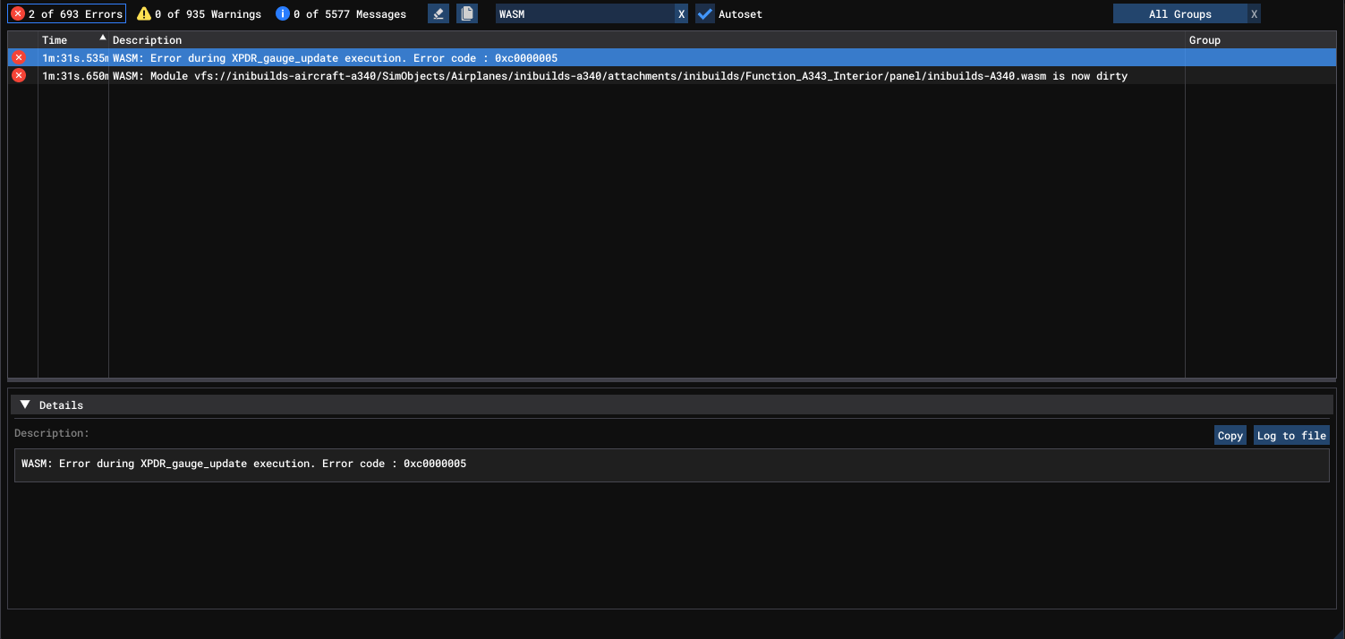 Same thing for, since SU4 I cannot spawn the A340 on the runway - it floats with landing gear retracted and orange screens with WASM crash in the cockpit. Starting cold and dark at gate is fine. Console errors (there are no details for either error):
