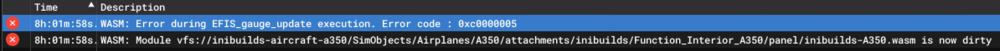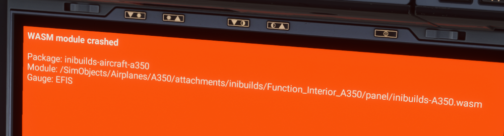 Inibuilds A350 Master WASM Crash Thread v1.2.0 FS2020 This thread will be the new location for all WASM Crashes relating to the Inibuilds A350-900/1000 for Microsoft Flight Simulator 2020 Below this message will be where users can upload their WASM Crashes pertaining to the current version of the A350. NOTES: If you do not see orange expectations screens on your displays or "WASM exception in X gauge" in the developer console it is not a WASM crash. The "sim-freeze" is a separate event that is tied to something on the server side which we are investigating with Asobo. All WASM Crashes existing in this thread will be removed following the release of a new update. i.e. Any Crashes identified in Inibuilds A350 v1.2.0 will be removed from the post following the release of v1.x.x and so forth. Please ensure that when posting WASM crashes you post the WASM log from the in-game console alongside any media (photo/video) and a brief description of what you were doing leading up to the crash. Instructions on what to do are located in this thread - Thank you -