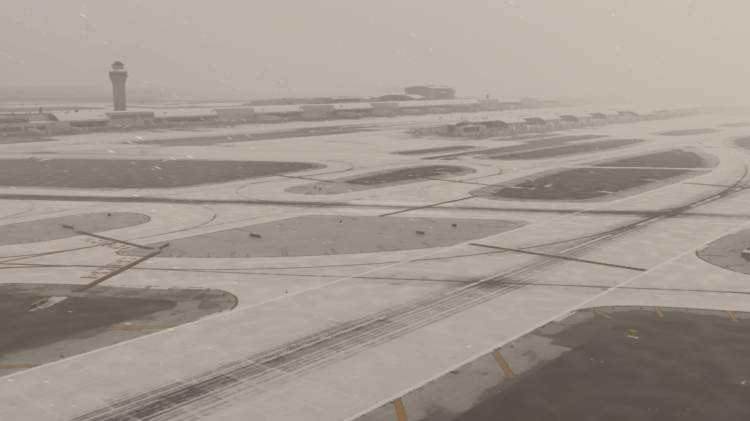 Hi, I looked into this issue with DTW in FS2024 and I was able to adjust the snow it is maximum density potentials in the weather tab and I was able to find that snow does accumulate on the runways and other hard surfaces do accumulate snow as seen below in the attached images. However as you did point out the grass areas and certain- -roads do remain without snow and this does come down to an established sim limitation in the thread below regarding LOWI and it's snow coverage: