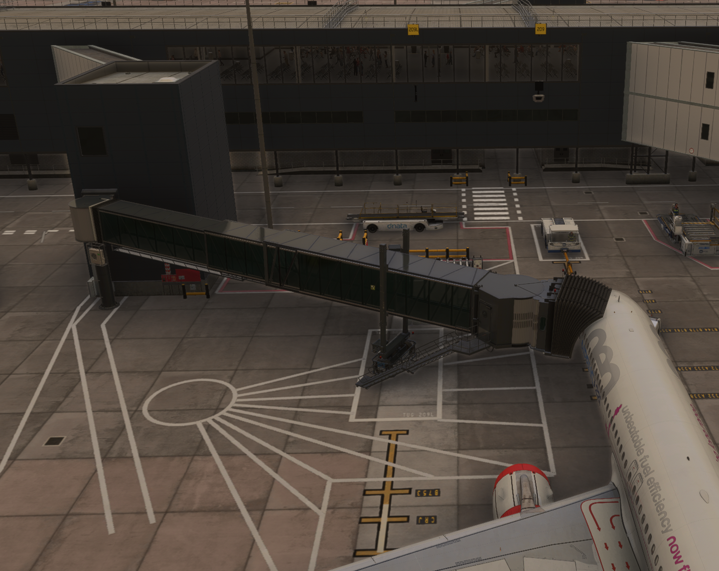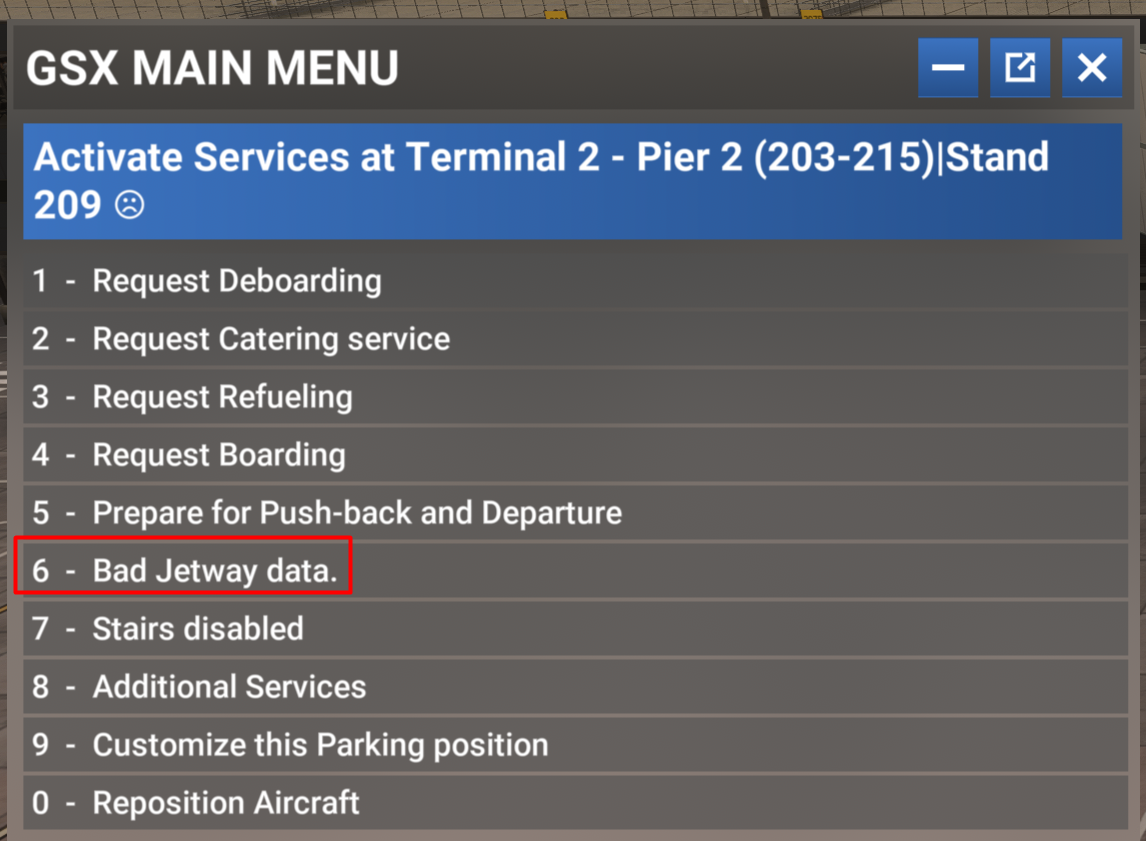 Hey Liam, Thanks for your report. 'No Jetways Here' Due to a sim limitation we are limited to just 1 jetway per gate. We cannot attach multiple jetways to the same gate , nor can we to attach the same jetway to multiple different gates. You can see the same in the GSX Gate Selection menu. The gates with jetways are indicated with 1x/J. 'Invalid Jetway Data' These might be a GSX profile bug. These will be seen as 0x/J on GSX. So for the reported instances: 308/308L - The jetway there is assigned to main gate (308) while the side gate (308L) is stairs only. 'No Jetway Here' is expected for 308L. 207/207R - The jetway there is assigned to the main gate (207) while the side gate (207R) is walk-in only. 'No Jetway Here' is expected for 207R. 209/209L - The jetway there is assigned to main gate (209) while the side gate (209L) is stairs only. 'No Jetway Here' is expected for 209L. However I do see that GSX cannot access Gate 209 and showing 'Bad Jetway Data'. The jetway itself is working directly via EFB request or sim ATC request as defined in the scenery though. Gate 209 seems to be the only affected gate in the entire scenery. Logged this for the team. Thanks!