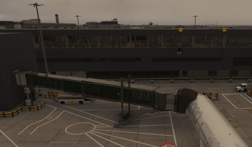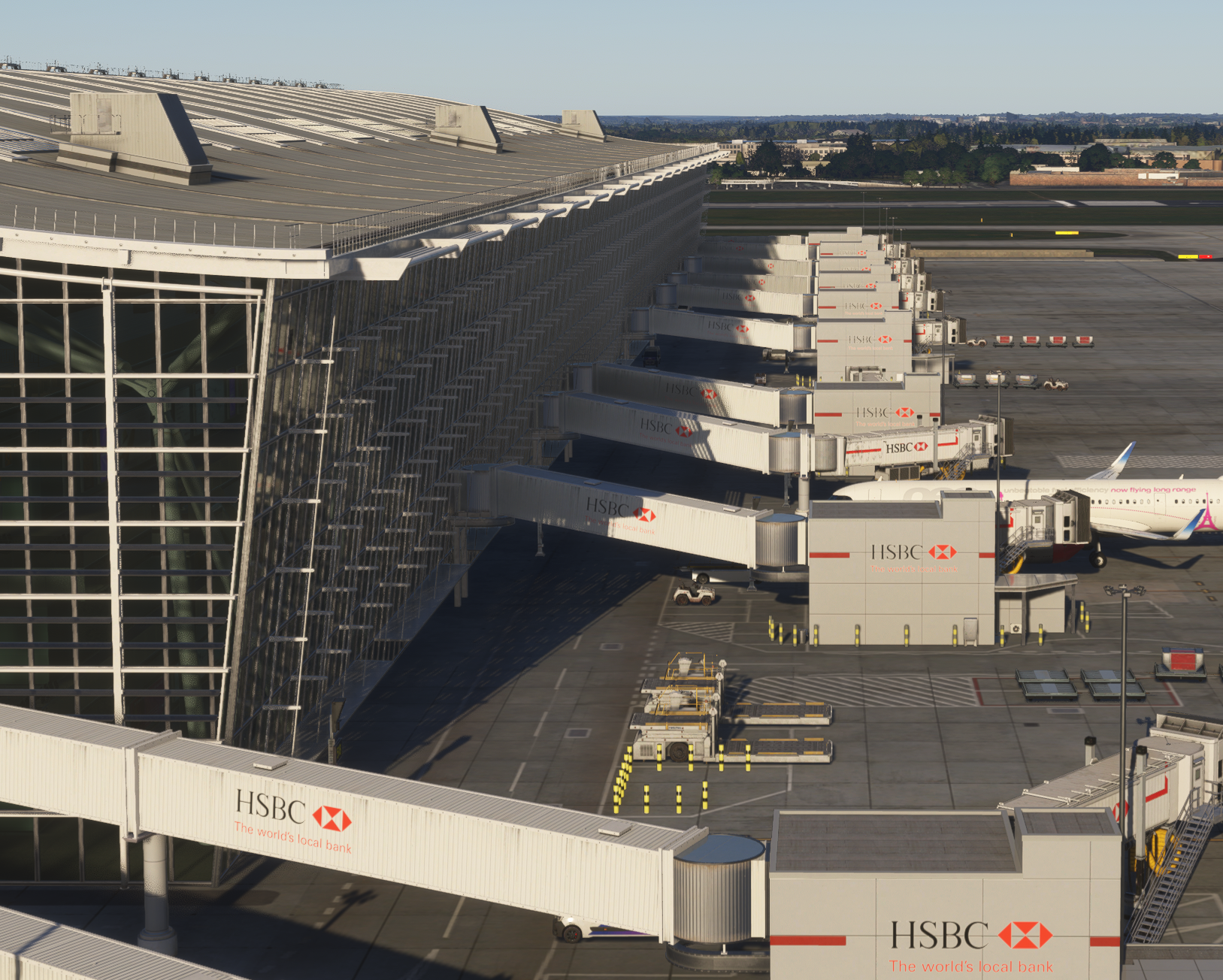 Hi Sorry for delay in response. Missing Red Horizontal Lines on T5A Jetway extensions - Logged for the dev team, the bug was reproduced Missing Logos / Plain White on T5A Jetway extensions - We cannot reproduce this issue on either HD/SD textures or with/without terminal interiors (see above image for ref). - The issue maybe because of a package conflict - either duplicated EGLL scenery installed or another installed scenery affecting the model/textures used. - Please verify via My Library that no other instance of EGLL is active. - To rule out other addon conflicts, try running with just EGLL in your community folder. Rename your existing Community folder (e.g. _Community), create a new one and place only inibuilds-airport-egll-heathrow inside. Clear your scenery indexes and load into EGLL to verify. To restore after testing, delete the new Community folder and rename your old folder back to Community. New HSBC Logo Your suggestion is noted. However please understand that our scenery was made with best available references we had at the time during development and the logos at present reflect that. Advertisements in particular are dynamic by nature and will keep changing over time so there will always be an element of "inaccuracy" in that regard with the digital twin counterparts. Thanks!