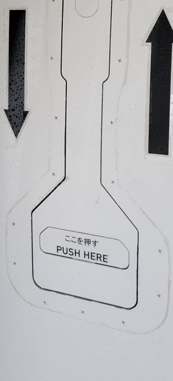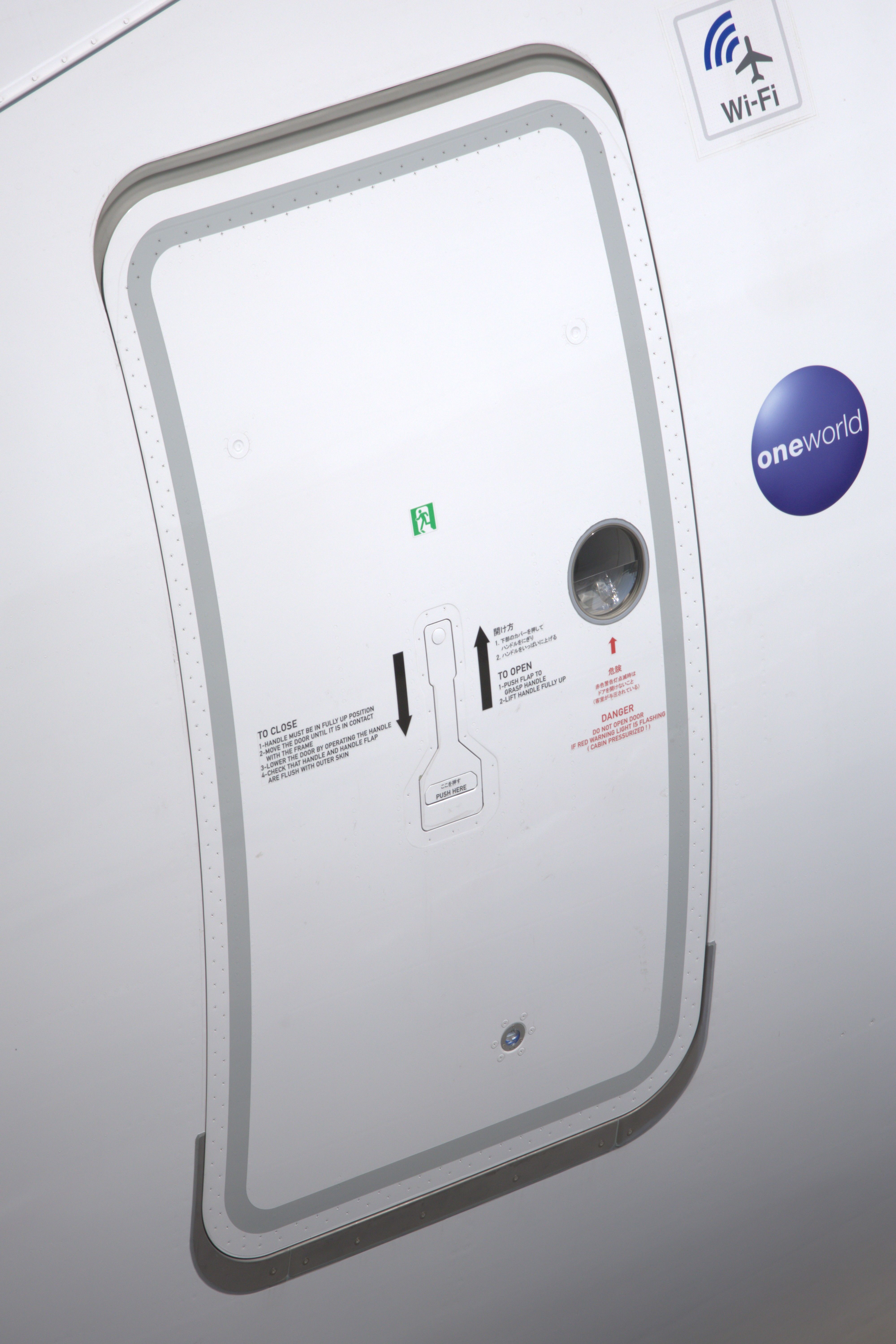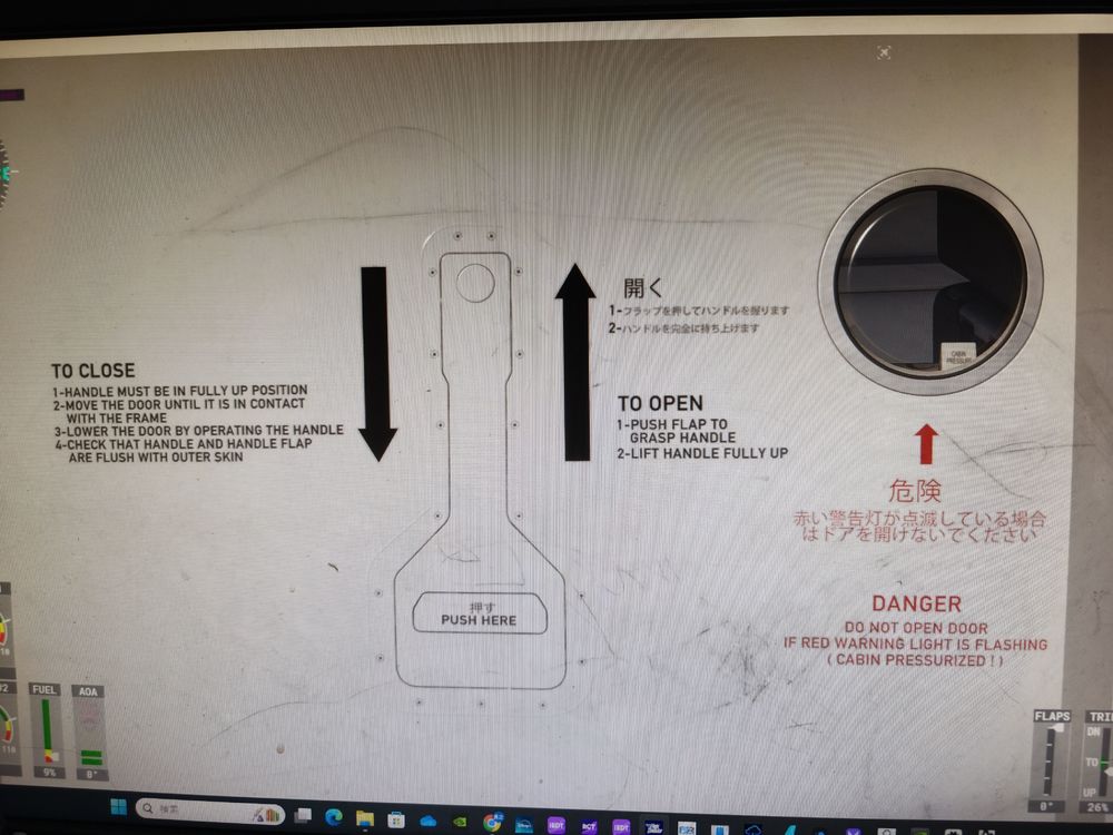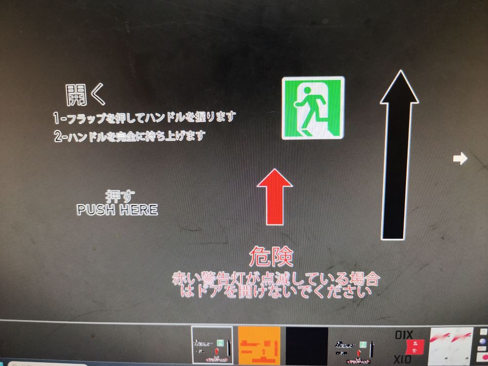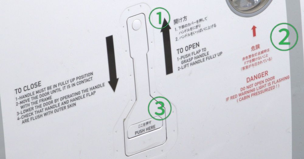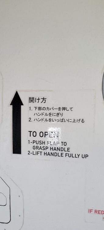 The Japanese written on the door is incorrect It is written exactly like this ① 開け方 1.下部のカバーを押して ハンドルをにぎり 2.ハンドルをいっぱいに上げる ② 危険 赤色警告灯以外の時は ドアを開けないこと (客室が与圧されている) ③ ここを押す There is no Japanese description of the cockpit escape hatch. ④ CLOSED →閉 ⑤ OPEN→開 ⑥ PUSH→押す Actual photo I want it to be rewritten in reality I use Google Translate