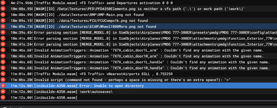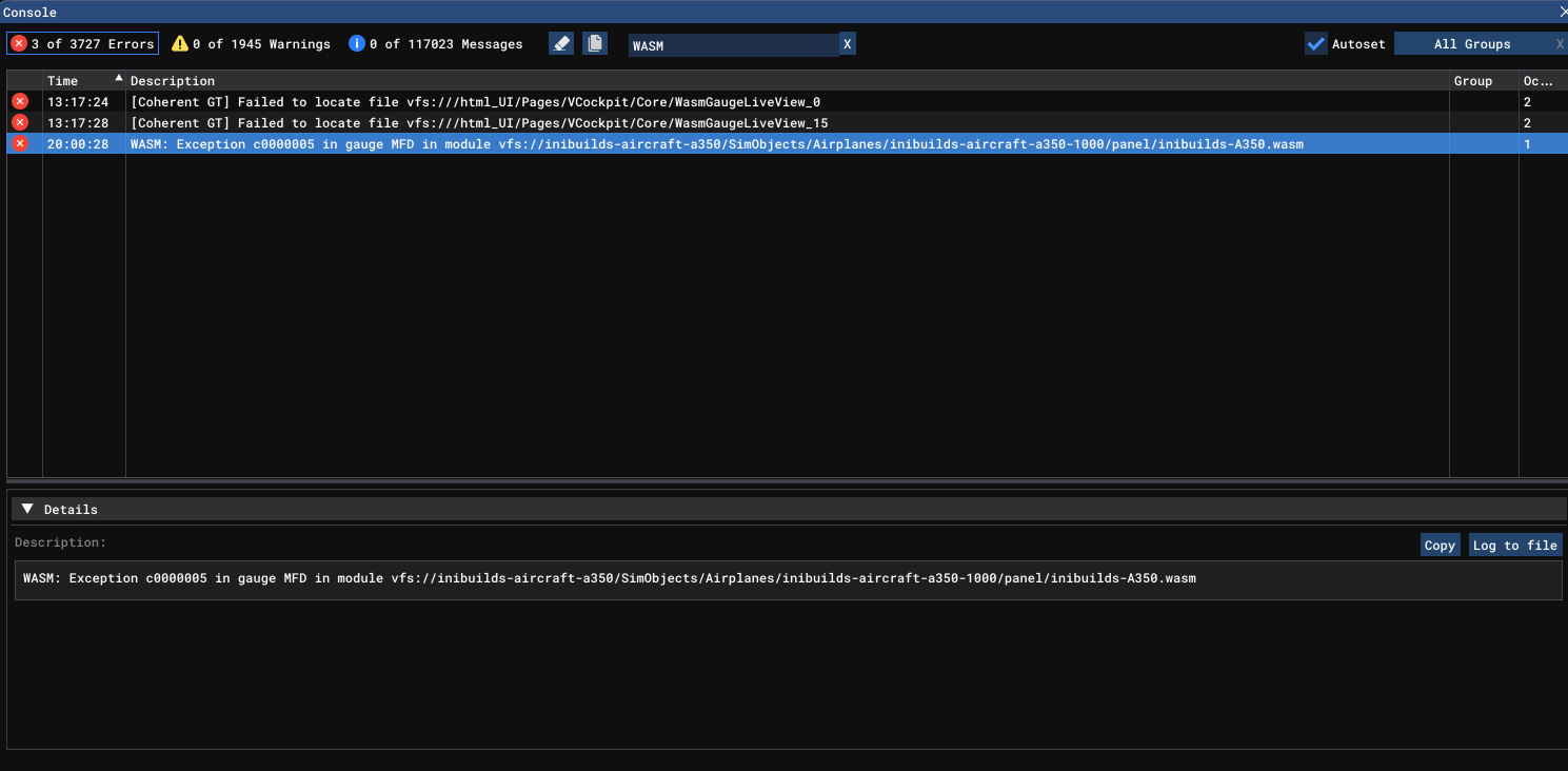 I had this WASM crash when I entered the OCK 'VIA' into the MFD on approach to EGLL To reproduce With existing F-PLAN loaded, enter the ARRIVAL page on the MFD from EGLL and modify TEMP F-PLAN changing VIA to OCK Doing so appears to trigger a WASM crash I had the same happen previously when entering OCK into the flightplan at the beginning of the flight, but unfortunately did not retain the details to log sufficiently. On second attempt (this event) I decided to save entering the VIA until after receiving clearance via BATC. Unclear whether specific to this procedure, product newly purchased/installed Information Aircraft: A350-1000 Simulator: FS2020 Navdata Method: NAVIGRAPH OFP: Attached from Simbrief Specs: i9-11900k, RTX 3070, 32GB RAM Autosave: Attached latest .BIN file before crash WASM: Exception c0000005 in gauge MFD in module vfs://inibuilds-aircraft-a350/SimObjects/Airplanes/inibuilds-aircraft-a350-1000/panel/inibuilds-A350.wasm 1771098877.bin KJFKEGLL_PDF_1771070127.pdf