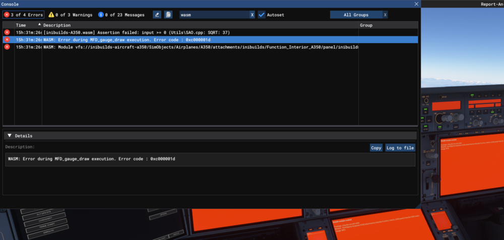 Aircraft: A350-1000 Simulator: FS24 Navdata Method: NAVIGRAPH OFP: Not to a specific route -- However this happened twice for me during a long flight (12+ hours). WASM Error: WASM: Error during MFD_gauge_draw execution. Error code : 0xc000001d Specs: Ryzen 7-8700F 8-core, NVIDIA GeForce RTX 4060 Ti 16GB, 64GB DDR5 Autosave File: Please include the latest ".bin" autosave file prior to your crash. Video of the crash won't upload due to file size. Link: https://streamable.com/zb4jae What happened was that I tried to enter the destination data for my arrival airport into the MCDU/FMC. I went to the PERF page and tried clicking on approach, but then it gave me a WASM crash. This is the second time this has happened. To reproduce: 1. Start a flight with the inibuilds A350 2. Fly a very long distance (ex. Middle East to the US) 3. Before descent, enter destination data in the MCDU/FMC 4. Go to the approach phase of the PERF page 5. WASM crash happens once attempts to open approach phase 1770058358.bin -