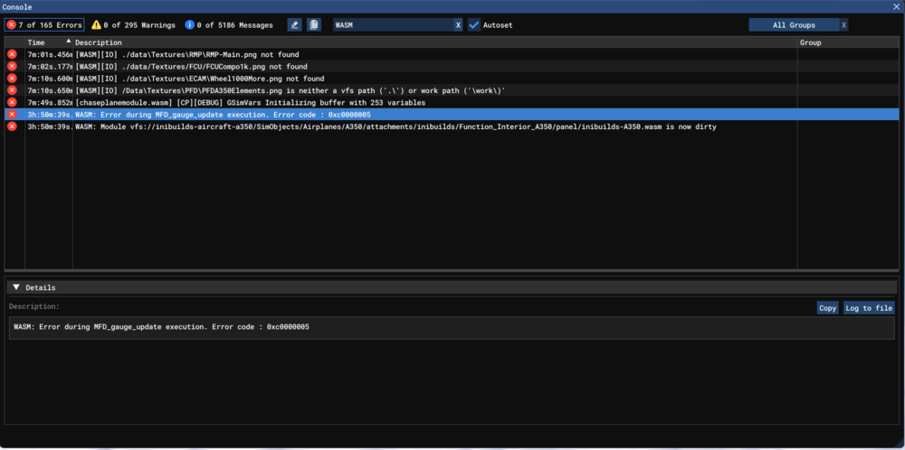 WASM Crash Report When the crash occurred, I was switching my approach into VHHH from RW25C to 07L on the flight plan page of the MFD. The exact moment I clicked the transition point "LIMES", the WASM crash occurred. Aircraft: A350-900 Simulator: FS2024 Navdata Method: NAVIGRAPH OFP: RJAAVHHH_PDF_1771894529.a10404a1.pdf WASM Error: WASM: Error during MFD_gauge_update execution. Error code : 0xc0000005 Specs: Ryzen 9 5900X, MSI RTX 4080, 64Gb DDR4 3600Mhz Autosave File: 1771907873.bin -