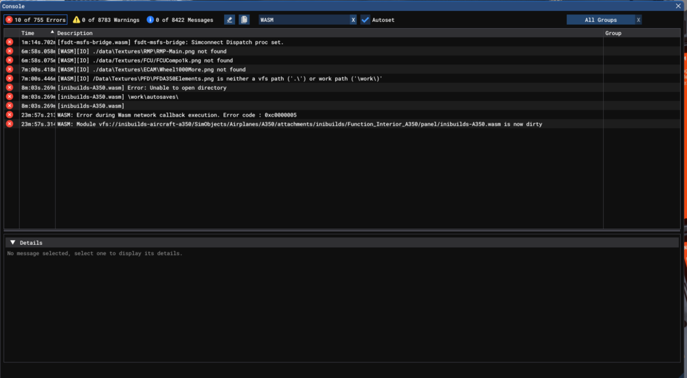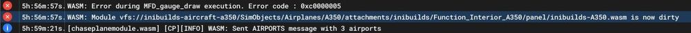 That's great to hear you may have an upcoming fix for the "Ghost WASM" issue! I have a long-haul flight I've stubbornly attempted many, many times (KDTW - RKSI, without FSUIPC, using SmartCARS), which always end up in this state (plane keeps moving, but avionics are frozen, can't control the plane). I usually use a lot of addons but attempted a barebones flight overnight with just FSUIPC + A Pilot Life. I hear FSUIPC alone may cause the issue but needed it for tracking the last particular test flight (KORD to LIRF). These are the addons/apps that I regularly use but completely disabled / did not open / removed from community folder for the A350 tests. The last flight was just FSUIPC + APL and still resulted in the Ghost WASM issue. Clear WASM cache before flight - after installing v1.2.4 Making sure Sayintentions/Hoppie IDs are not entered in the OIS. Used the No Cabin Version Used Delta Livery from the iniBuilds app. Removed all other liveries/addons from community folder Verified during the entire flight, my GPU (RTX 3080, 10GB) VRAM was < 70% Process Lasso Chaseplane 2024 Flow SayIntentions.ai Navigraph Simlink (known culprit) Spad.next Moza Cockpit (for MTQ, AB9) FSFO 6 Disabled Photogrammetry, All traffic. Used MSFS Sim Real Time/Weather Windows Apps Disabled all Bitdefender protections, other than the Firewall Made sure Powertoys is not running Killed unnecessary Windows Services Kill all other background apps - Browsers, Discord, etc. Let me know if any more information (or tests) from me could help you troubleshoot the Ghost WASM issue. When I experience the freeze, I check the console, Simconnect Inspector and don't see any relevant WASM errors or "noisy" simconnect apps. I was considering writing a program next to check for the ghost WASM issue (checking if certain Simvars are no longer changing) and automate pausing the sim, send me a notification. Then I could restart the flight w/ Autosave to resume. Sounds like I can just wait for the update! Thanks! -