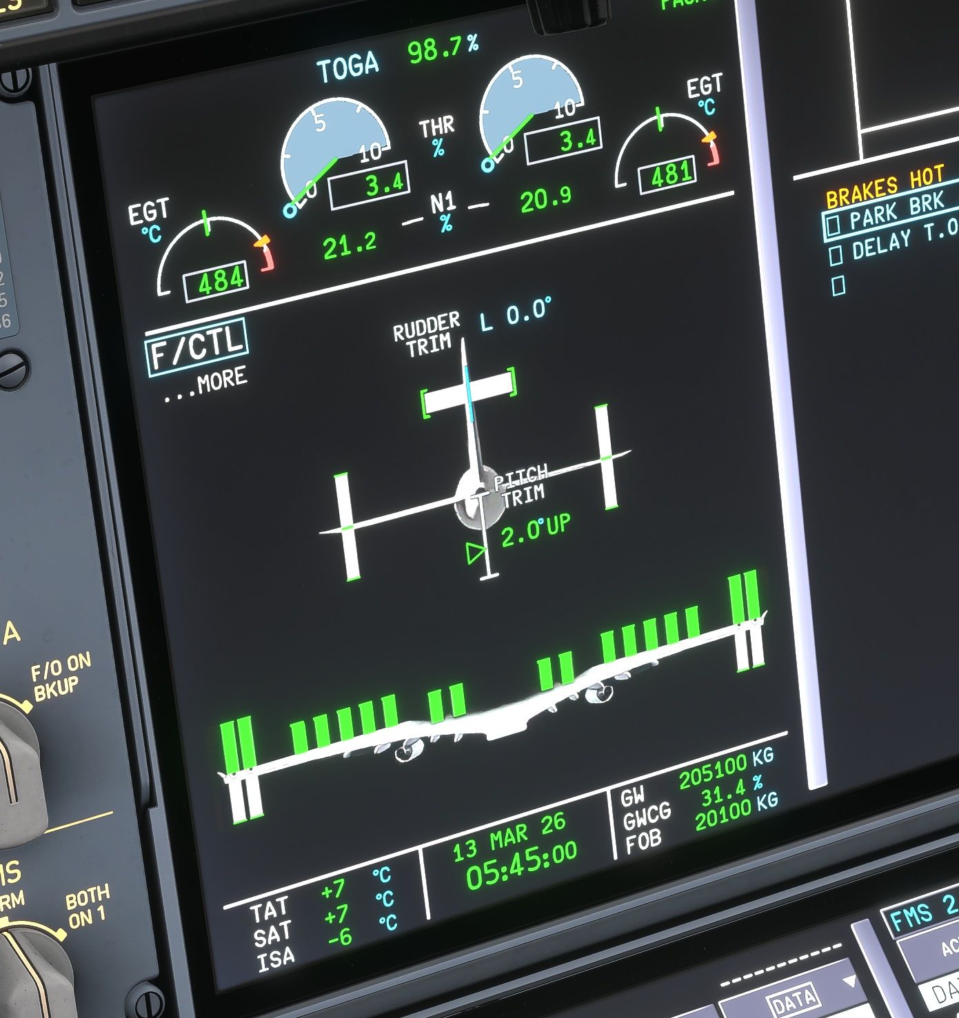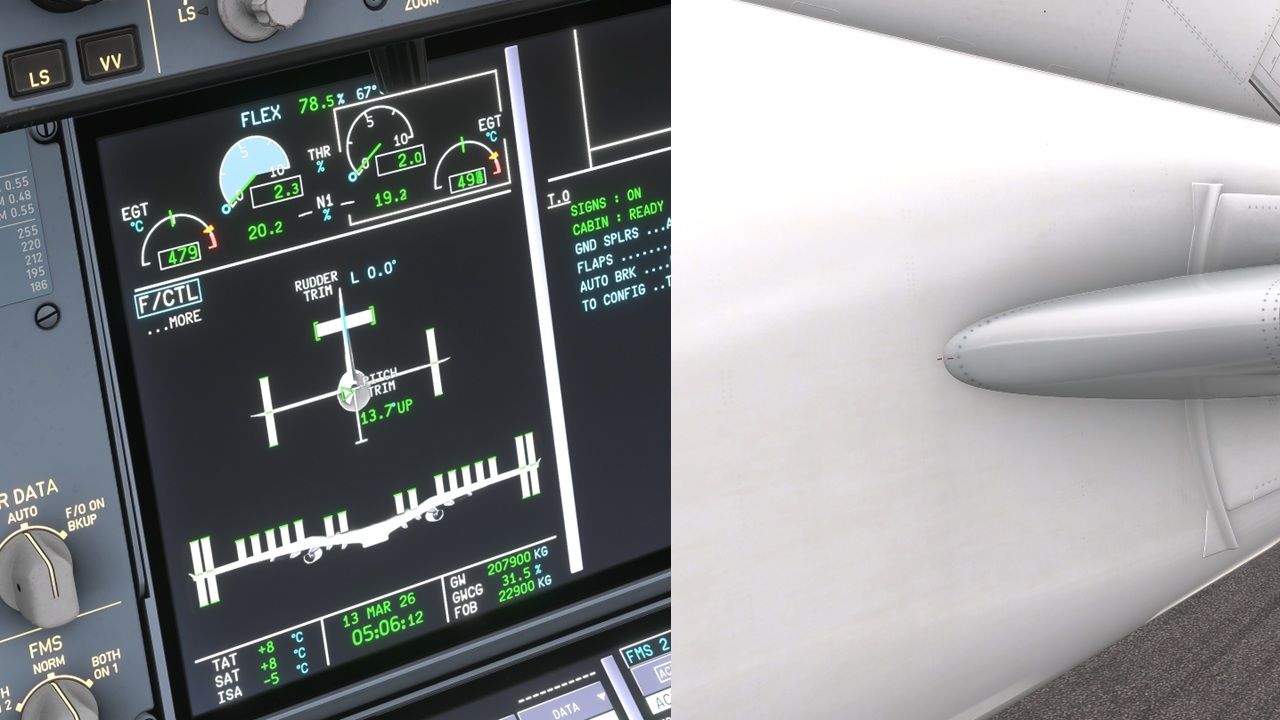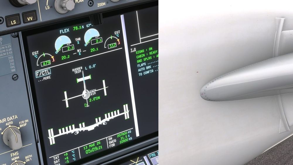Regarding the FCOM, I'll send you a DM. The pitch trim position can be observed from the F/CTL SD page. I checked again the functioning of the THS in the sim and I noticed the following issues: The THS range is incorrect, it is from 13,7° UP to 2,0° DN. It should be from 13,7° UP to 0,8° UP. THS moves to after landing position right after touch down, it should move below 30kts. The after landing position of the THS is incorrect, 2,0° UP. It should be 0,8° UP as described in the FCOM. The pitch trim indicator on the F/CTL SD page does not reach the bottom of the scale when the trim is in the lower end of the trim scale. THS is incorrectly animated in the outside view. When the THS is in the full UP position, 13,7° UP (that means aircraft nose up, not the THS itself), the leading edge of the THS should be fully down. And vice versa: when the THS is full DOWN position, 0,8° UP or "the maintenance position", the leading edge of the THS should be fully up and the indicator lines on the left side of the tail should be aligned. This movement to maintenance position can also be observed in the Cathay video above. 1. This is pitch trim 13,7° UP and corresponding THS position in the outside view. This is how the outside view should look like when the THS is in the other end of the trim scale (0,8°UP). Also note the indicator lines aligned. 2. This is pitch trim at 2,0°DN and the corresponding THS position in the outside view. Should be the other way around as stated above. Also note the pitch trim scale on the F/CTL SD page. 3. This is the current after landing trim setting (should be 0,8°UP).