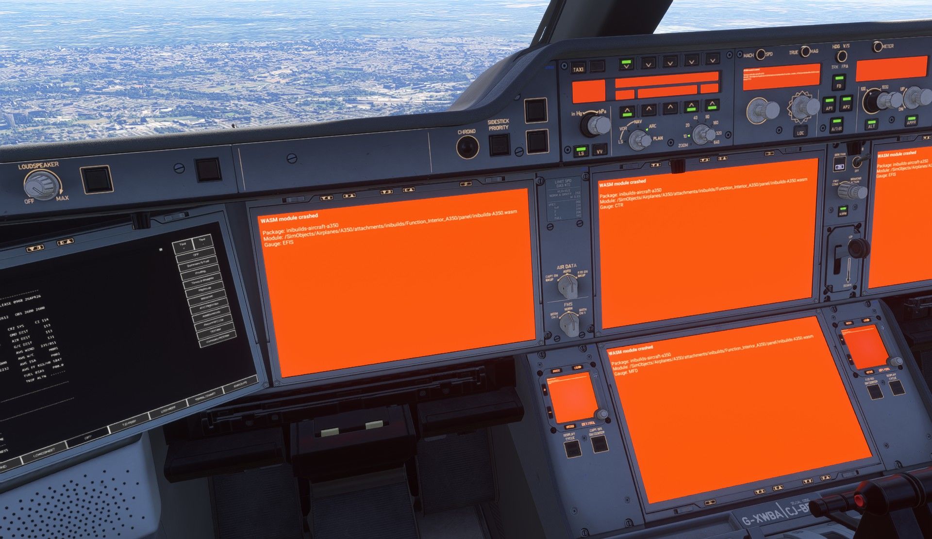 Latest update 1.2.5, still getting crashes WASM: ERR_FATAL_FILE_ERROR (-239 / ffffff11) WASM: Error -239 / ffffff11 [SS_WMKK_Airport_Driver.wasm] SS_WMKK_Airport_Driver: Initializing Version [1.20.40] [SS_WMKK_Airport_Driver.wasm] SS_WMKK_Airport_Driver: Connected to FS2020 [SS_WMKK_Airport_Driver.wasm] SS_WMKK_Airport_Driver: The FS2020 subscriptions have been registered. [SS_WMKK_Airport_Driver.wasm] SS_WMKK_Airport_Driver: Airport data populated. [fsdt-msfs-bridge.wasm] fsdt-msfs-bridge: Simconnect Dispatch proc set. [noolaero-vdgs-lppt.wasm] [noolaero-vdgs-lppt] EXCEPTION 25: The AI operation requested cannot be completed [noolaero-vdgs-essa.wasm] [noolaero-vdgs-essa] EXCEPTION 25: The AI operation requested cannot be completed [noolaero-vdgs-eidw.wasm] [noolaero-vdgs-eidw] EXCEPTION 25: The AI operation requested cannot be completed [noolaero-vdgs-lszh.wasm] [noolaero-vdgs-lszh] EXCEPTION 25: The AI operation requested cannot be completed [noolaero-vdgs-bikf.wasm] [noolaero-vdgs-bikf] EXCEPTION 25: The AI operation requested cannot be completed [noolaero-vdgs-ksea.wasm] Sim | EXCEPTION 25: The AI operation requested cannot be completed [noolaero-vdgs-klga.wasm] [noolaero-vdgs-klga] EXCEPTION 25: The AI operation requested cannot be completed [SS_WMKK_Airport_Driver.wasm] AIRCRAFT_TITLE[0]: A350-900 (Default Cabin) [SS_WMKK_Airport_Driver.wasm] INIBUILDS: A350-900 (Default Cabin) [WASM][IO] ./data\Textures\RMP\RMP-Main.png not found [WASM][IO] ./data/Textures/FCU/FCUCompo1k.png not found [WASM][IO] ./data\Textures\ECAM\Wheel1000More.png not found [WASM][IO] /Data\Textures\PFD\PFDA350Elements.png is neither a vfs path ('.\') or work path ('\work\)' WASM: Error during EFIS_gauge_draw execution. Error code : 0xc0000005 WASM: Module vfs://inibuilds-aircraft-a350/SimObjects/Airplanes/A350/attachments/inibuilds/Function_Interior_A350/panel/inibuilds-A350.wasm is now dirty