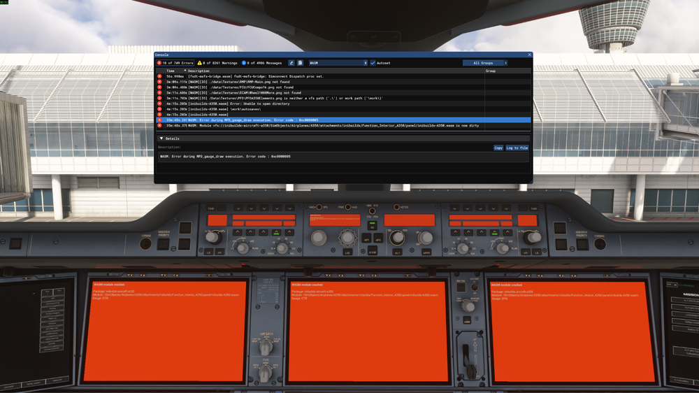 The crash happens changing the runway from 27R to 27C at KORD. I don't know why but 27C was shown twice in the selection menu. Maybe a navdata issue that warrants the crash. Aircraft: A350 / No Cabin / Simulator: FS2024 SU4 Version: 1.2.4 Navdata Method: MSFS OFP: KDFW-KORD WASM Error: WASM: Error during HUD_gauge_update execution. Error code : 0xc0000005 WASM Error: WASM: Module vfs://inibuilds-aircraft-a350/SimObjects/Airplanes/A350/attachments/inibuilds/Function_Interior_A350/panel/inibuilds-A350.wasm is now dirty