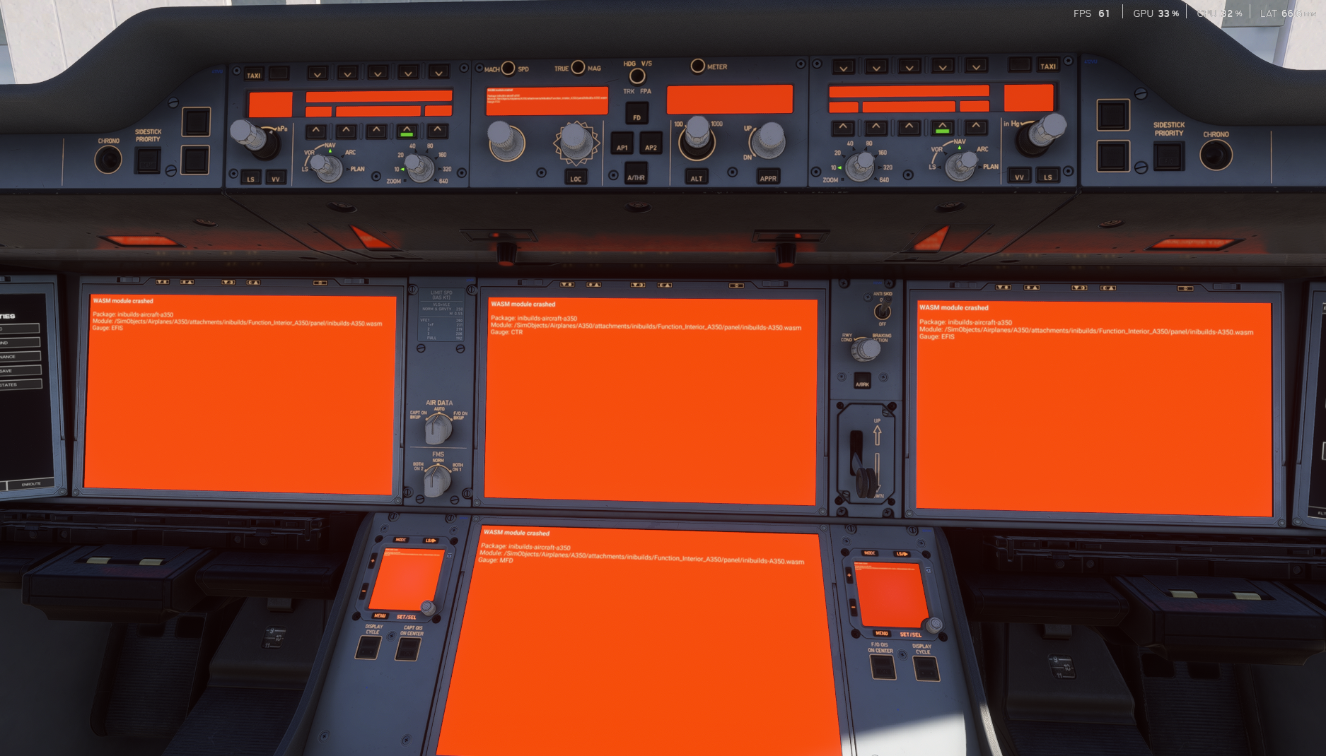 @C. Schaffhausen Thank you, I have tried clearing the WASM folder multiple times and even a clean install of Windows very recently (24th of March, 2026), it hasn't worked. About the package reorder tool, I don't use the package reorder tool for any of my addons, including the A350, I allow the respective installer to put everything in my Community folder as it defaults on most installers. Also, before the issue and during the issue, I have never had a Navigraph subscription or any Navigraph software besides Simbrief. When the issue began I uninstalled Simbrief and any software that interacted with MSFS (except the installers) and still the issue has not gone away. And in my new clean install of Windows, I do not have any other software besides the installers that interact with MSFS. The addons I have install besides the Inibuilds A350 (From iniManager), are: Aerosoft Paderborn Airport (From MSFS Marketplace) Drzewicki Design Radom (From MSFS Marketplace) Everything included in my Microsoft Flight Simulator license and additional free Asobo and Microsoft Aircrafts, Missions and World updates (except the Dune and Halo aircraft) FlybyWire A32NX (From the FlybyWire Installer) 4 flightsim.to airports Microsoft ATR Inibuilds Milwakee (From the iniManager) I have tried the ini A350 with all of these addons not installed right after my clean installation of Windows and the issue is present no matter at what airport I spawn the A350. -