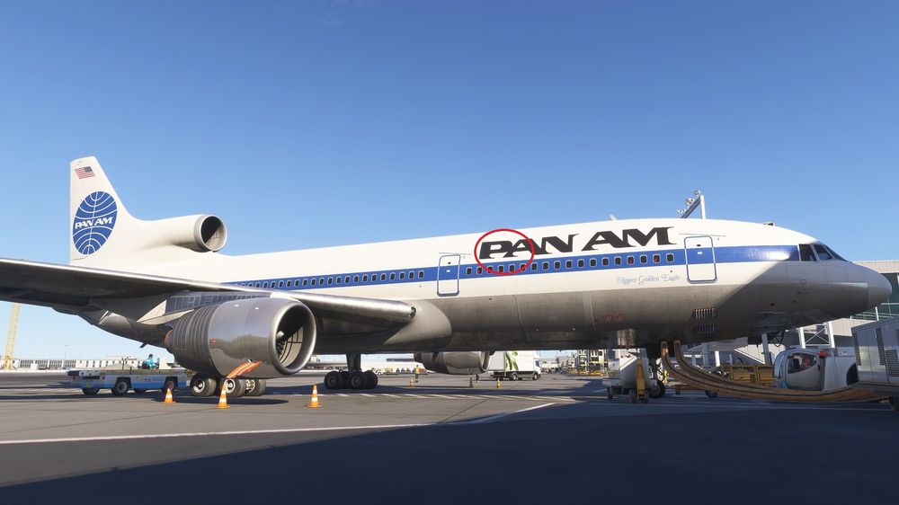 The Pan Am L1011-500 has texture issues with the right side main landing gear door. Also the starboard side forward Pan Am logo the letter "P" is incorrectly angled at the top thanks