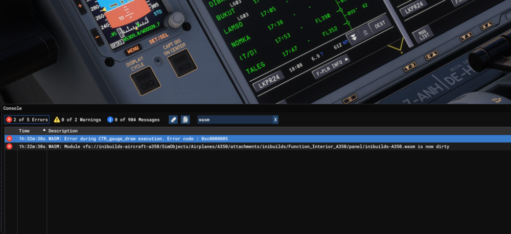 1. Aircraft: A350-1000 Simulator: FS2024 Navdata Method: NAVIGRAPH OFP: Not required, happens anythime WASM Error: WASM: Error during CTR_gauge_draw execution. Error code : 0xc0000005 Specs: 13th i9-13980HX 2.20 GHz, 32.0 GB, RTX 4070 To reproduce Cruising Click VIDEO button Systems freeze