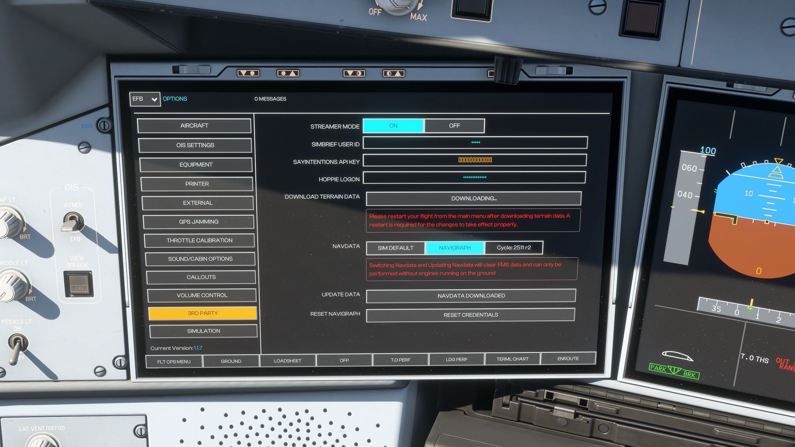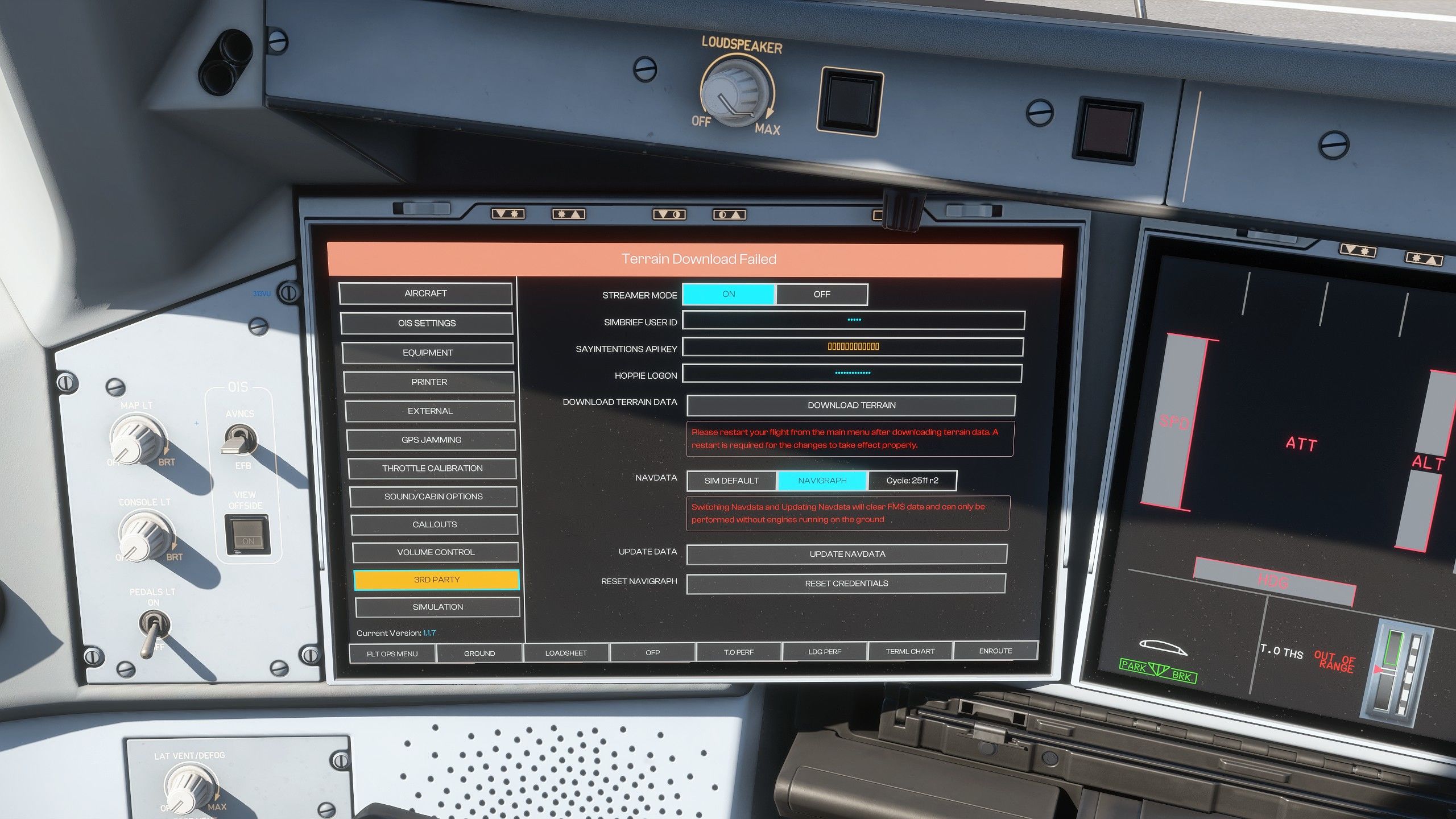 1. I simply cannot download the terrain data. The OIS will either throw a "Terrain Download Failed" error or just get stuck in an infinite "Downloading" state. Troubleshooting steps done so far: I have cleared the WASM files in \LocalState\WASM\MSFS2024\inibuilds-aircraft-a350 4 times (the obj, lib, cache files as outlined in the clearing WASM guide) I have deleted the work folder itself \LocalState\WASM\MSFS2024\inibuilds-aircraft-a350\work I have deleted the entire inibuilds-aircraft-a350 folder in \LocalState\WASM\MSFS2024 I have done one full reinstall I have tested with turning of windows defender realtime scanning I have added windows defender exceptions as outlined in this inibuilds guide https://forum.inibuilds.com/topic/34534-how-to-download-terrain-data-via-the-ois/ I have tried removing my Navigraph credentials A full sim restart is done after every step above. None of the troubleshooting steps I've done above helped. Still the same problem. How do I know It's stuck at downloading? I left it running with the button showing "downloading" for 45-minutes. Is it a sim to Internet communication problem? Everytime I cleared the WASM folder, I am able to download and update the Navigraph data perfectly fine, so the sim can communicate to the internet fine.