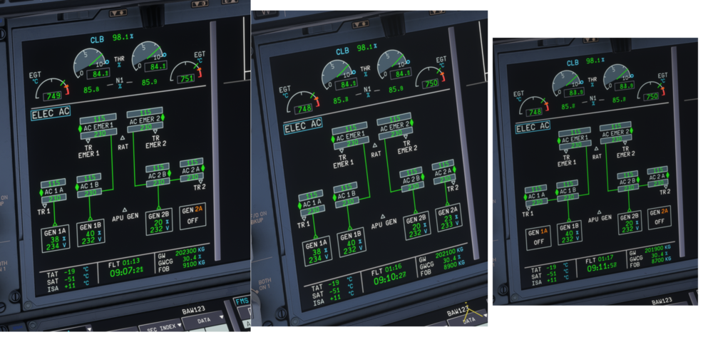 The load on generators don't seem to vary as other generators are switched off. E.g. GEN 1B is always at 40%, regardless of whether 1A is ON or OFF. Shouldn't the load increase when 1A is OFF? Similarly, switching the APU on doesn't change it: v1.0.6 / MSFS 2024 SU1