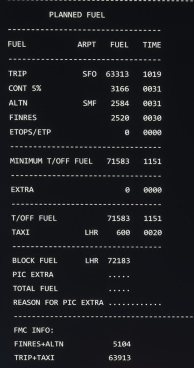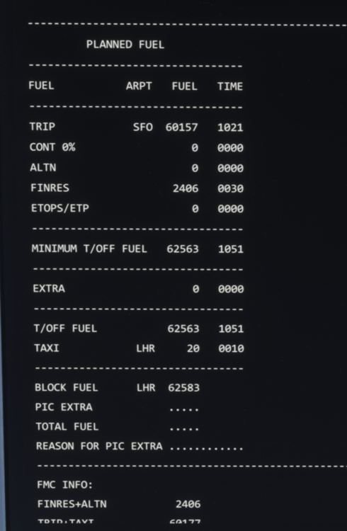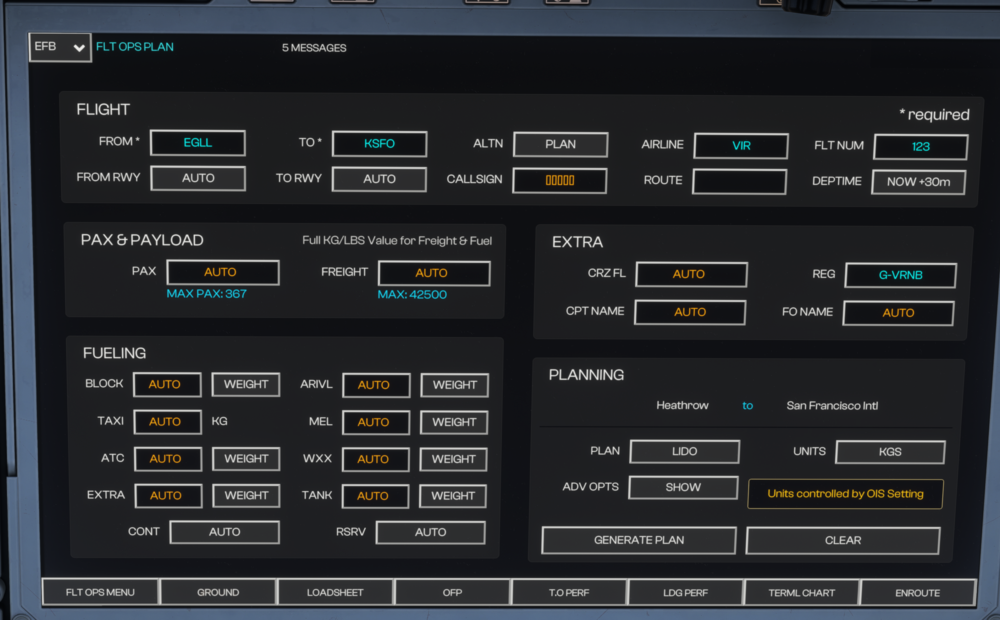When I use FLT OPS PLAN to create a flight plan, I leave the FUELING section at their defaults of AUTO and ALTN PLAN with all settings AUTO. After clicking GENERATE PLAN, this however results in planned fuel of 0% for CONT / ALTN: If I do the same in SimBrief (using the Simbrief dispatch plugin or website) with Alternate and Contingency both set to AUTO, I get some fuel for both: I can set CONT to 5% and PLAN NUM ALTERNATES to 1 to get similar results, but why is the AUTO setting giving 0 CONT and no ALTN? Cheers.