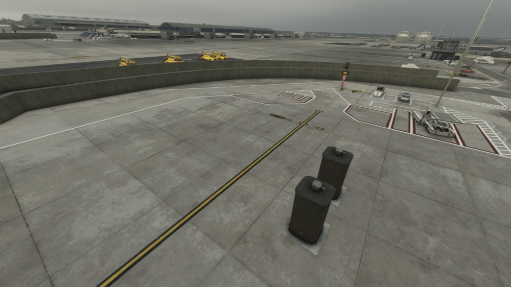 I remember people mentioning the area on the south side of T5C. This area is used to offload transfer bags via conveyer belts which can be found under the sheltered section that extrudes out from the main building. These belts (8, 4 each side) are a navy blue colour which are on the side of the building facing the aprons. Also, there are 2 yellow conveyer belts on the directly on the south side of T5C. Currently, you have parked vehicles on the north side of T5C however, there is a ULD stillage as shown in the image below. The building on the right is 1 ULD story high with a grey roof over the top. The stillage area to the west of it is a 3 story high ULD stillage with no roof. Additionally, north of T5B, there is another 3 story ULD stillage and a building which houses 2 yellow conveyer belts which in your scenery, is currently an empty space with just road markings. There is also an Iberia only ULD stillage bin to the north of T5A, near the security post. A similar ULD stillage can also be found at T5C, on the eastern side of the slope from the tunnel to enter the T5C road network. I have attached below an image that describes T5D (remote stands) best. The purple circle is where servicing machinery (baggage loaders etc) are maintained/serviced. The yellow circle is a petrol/diesel station for automotive vehicles (such as tugs or vans). The red circle is a fuel parking area for Menzies refuelling vehicles. The green circles indicate a parking area for airport winter machinery. Another point to make, there are some markings that are missing such as, red lines lining the white lines of the designated parking spots on stand, the zig-zag lines either side of every intersection clearway (the area in-between stands for aircraft emergency & servicing vehicles), hatched areas to indicate no parking at all and, the "starburst" lines that emit from the area where the jetway should be parked when not in use. Finally, I noticed that in your scenery, the fixed jetways from T5A to the moveable jetways have an incline however, in real life they do in fact have a decline down towards the "node". In addition, the east side of T5A, ground floor, is used for buses to pick up passengers from the terminal to take to remote stands which, is not clear/well represented in my opinion. I think it's these little things that will enhance the immersion of the simming experience. -