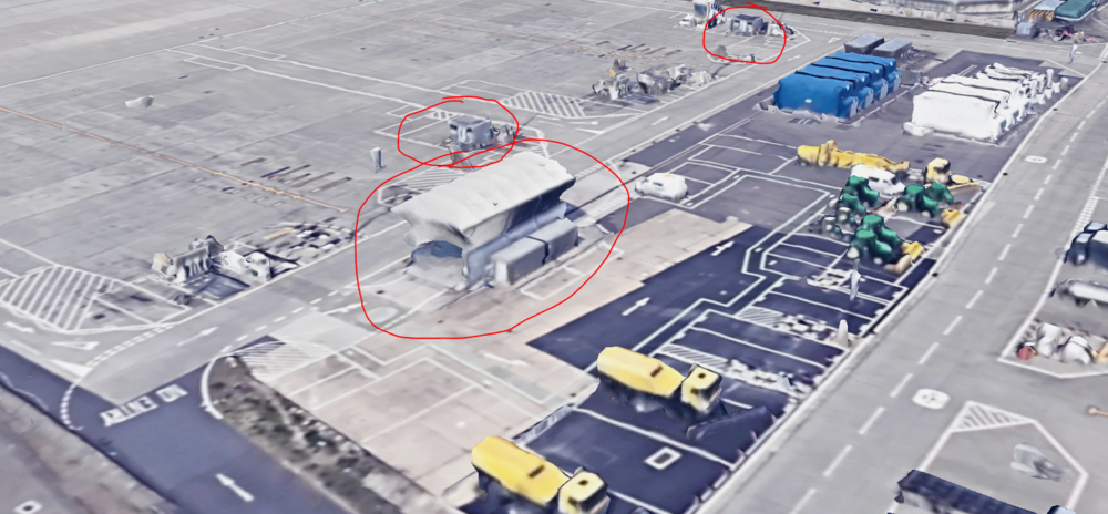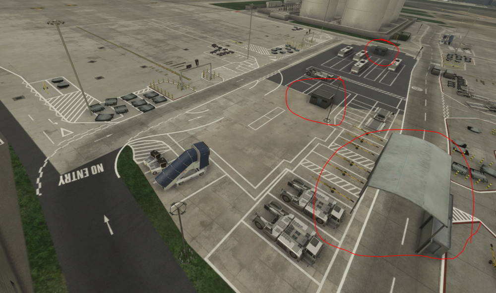 I also think these 3 buildings (circled) have also been moved east from their original position. As the nodes (huts) are meant to be on the 573 & 572 stands. In addition, the refuelling area cover (circled bottom right) should be on the other side of that parking area, where there's is an empty gap in the through road.