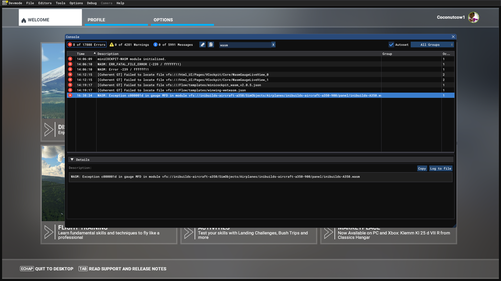 Aircraft: A350-900 v1.0.4 Simulator: FS2020 Navdata Method: NAVIGRAPH OFP: Not related to route (but I can provide it if needed, it was departing runway 14R, FISTO7A SID) WASM Error: WASM: Exception c0000005 in gauge EFIS in module vfs://inibuilds-aircraft-a350/SimObjects/Airplanes/inibuilds-aircraft-a350-900/panel/inibuilds-A350.wasm Specs: CPU: Intel 14900k, GPU: Nvidia RTX 4080 Super, RAM: 64GB DDR5 Description of the problem: Had a WASM crash on the ground at LFBO when trying to display the airport map Video of the crash: Crash is at 14:56 and I show the console at 15:50, but i uploaded the whole flight preparation maybe there are some other steps before leading to the crash (like the ALT blue mode flicker idk)