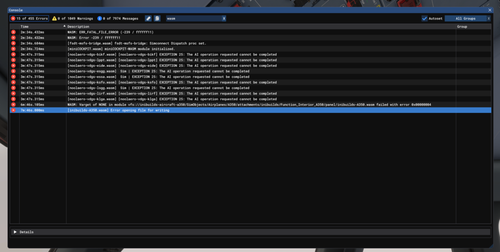 Happens when loading the A350 at gate, I did a full reinstall with WASM folder deletion but i still have the problem It is not a full crash because i am still able to fly the aircraft, but maybe it causes instability and crashes like reported here Aircraft: A350-900 or -1000 Simulator: FS2024 SU1 Navdata Method: NAVIGRAPH OFP: None WASM Error: WASM: Varget of NONE in module vfs://inibuilds-aircraft-a350/SimObjects/Airplanes/A350/attachments/inibuilds/Function_Interior_A350/panel/inibuilds-A350.wasm failed with error 0x00000004 Specs: CPU: Intel 14900k, GPU: Nvidia RTX 4080 Super, RAM: 64GB DDR5 Autosave File: None (they were created after)