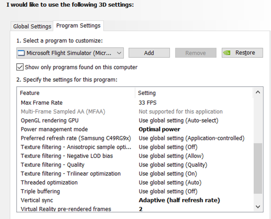 6. I just installed KLAX for MSFS. My FPS is set to 33 max in the NVIDIA control panel. Before installing LAX, I typically got 30-33 FPS with the Fenix A320. After the LAX install, 15-28 fps is typical. Lot's of lag. I have changed a lot of settings and nothing seems to work. I have no other add-ons installed. Any advice would be much appreciated. Below are my system specs and screen prints: i9 10900K (Liquid cooled) Windows 10 Home, 64-bit RTX™ 2080 SUPER 8GB GDDR6 32GB Dual Channel HyperX™ FURY DDR4 XMP at 3200MHz; up to 64GB (additional memory sold separately) Hard Drive: 2TB M.2 PCIe NVMe SSD (Boot Drive) 2nd Hard Drive: 2TB WD Blue 3D NAND SATA SSD 2.5” 1000W Power Supply 247 UPDATE Log for NVIDIA GeForce RTX 2080 SUPER 10/13/2022 Driver version 522.25 MSFS Options Screen print TRAFFIC DATA NVIDIA Settings: Global settings: Program Settings: