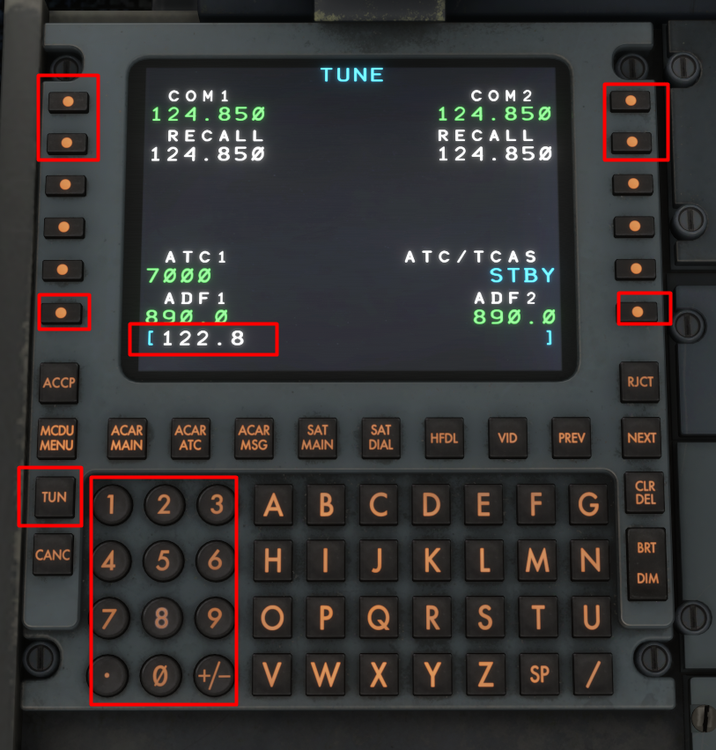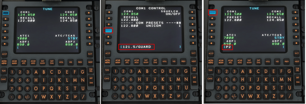 Press the TUN button to access the TUNE page of the IDC where you can select the desired COM 1/2 frequencies, along with the ADF 1/2 frequencies. Simply use the number pad to type the desired frequency into the scratchpad (e.g 122.8). Then select the appropriate LSK (e.g. LSK L1 for COM 1 active frequency). You can swap between the STBY and ACTIVE frequency by pressing the RECALL LSK (e.g. LSK L2 for swapping COM1 standby frequency in white to the active frequency in green). To access the COM/ADF CONTROL page, ensure you have an empty scratch pad and then click the active COM/ADF frequency by selecting the appropriate LSK (e.g. LSK L1 for COM1 CONTROL page). Here you may define COM PRESETS by typing in the following format XXX.XXX/NAME (e.g. 121.5/GUARD) and then selecting the appropriate LSK (e.g. LSK L4 for COM PRESET #2). You may save up to 3 presets. To use a PRESET frequency, return to the TUN page and type into scratchpad PX (where X is the desired preset number, e.g. P2 for 121.500). The select the desired LSK (e.g. LSK L1 for Preset #2 of COM 1). For more information on IDC Operation and how to log-on to to the Hoppie Network, please see the linked video below: