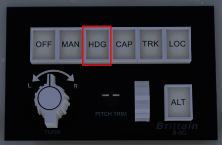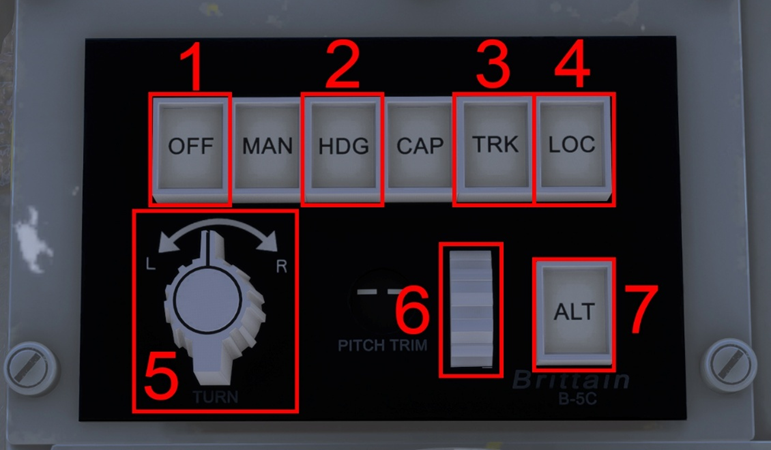 The YS-11 is equipped with the Brittain B-5C, three-axis Automatic Flight Control System—a robust, low-power autopilot designed to enhance stability and reduce pilot workload across roll, pitch, and yaw axes. The B-5C integrates seamlessly with the aircraft’s navigation system to provide smooth course tracking and altitude hold. Its simplicity, reliability, and minimal electrical draw make it especially well-suited for regional turboprops like the NAMC YS-11, where operational efficiency and mechanical resilience are paramount. Autopilot Control Panel 1) Autopilot Disengage 2) Heading Hold 3) NAV Hold 4) Localizer and Glideslope Hold (APPR Mode) 5) Turn Knob 6) Vertical Speed Selector 6) Altitude Hold Engaging the Autopilot The B-5C autopilot system lacks a dedicated master switch for activation. Instead, engagement occurs through the selection of a lateral mode—such as Heading Hold, Nav Hold, or Localizer Hold. Activating any of these modes automatically engages the Vertical Speed mode, maintaining the aircraft’s vertical speed at the moment of engagement. An alternative method of engaging the autopilot is through the Altitude Hold function. However, this activates only the altitude control—lateral guidance must be selected separately via Heading Hold, Nav Hold, or Approach Hold to achieve full autopilot functionality. Engaging Heading Hold Select the desired heading in the Directional Gyro using the Heading Knob. The knob can also be pushed to synchronize the bug to the current heading. Press HDG in the Autopilot Control Panel. Note: this will engage the Vertical Speed mode as well and maintain the vertical speed present at the moment of engaging Heading Hold. Engaging Altitude Hold Press ALT, this will command an immediate level off at the current altitude. Note: if the autopilot was not previously engaged only the ALT mode will engage. A lateral mode must be subsequently engaged if desired. Commencing a Climb/Descend Disengage the Altitude Hold mode if it was previously engaged. Turn the Vertical Speed Selector to select the desired vertical speed target. The target will be displayed as a tooltip and can be seen by placing your cursor over the selector. Using the Turn Knob If the autopilot was not previously engaged, engage it by first selecting Heading Hold. Turn the knob to the left or right to initiate a turn in the desired direction. When the desired heading is reached, turn the knob back to the middle (neutral position). Note: The turn will continue as long as the knob is not neutral. Capturing and Tracking a VOR Radial Tune the desired VOR in the NAV/DME radio. Note: ensure the unit is turned on. This is controlled by the top left switch. If using a GPS unit, VLOC must be displayed. If GPS is displayed, press the CDI button to change the guidance to VLOC. Select the desired course in the Course Deviation Indicator by using the lower left knob. The course is displayed at the top of the instrument (020 in this case). The top right knob reverses the set course by 180º. Press TRK to engage the mode. Capturing and tracking the GPS Route In your desired GPS unit, select GPS. If VLOC is displayed, press the CDI button to change the guidance to GPS. Press TRK to engage the mode. The autopilot will now follow the GPS guidance. Executing an ILS Approach Tune the desired ILS in the NAV/DME radio. Note: ensure the unit is turned on. This is controlled by the top left switch. If using a GPS unit, VLOC must be displayed. If GPS is displayed, press the CDI button to change the guidance to VLOC. Select the desired course in the Course Deviation Indicator by using the lower left knob. The course is displayed at the top of the instrument (020 in this case). The top right knob reverses the set course by 180º. Press LOC to engage the Approach mode. Note: the real autopilot was capable to only track the Localizer, hence the LOC text in the button. For ease of use it was decided to simulate the Approach mode (Localizer and Glide Slope tracking). The Glide Slope indication is shown in this image. The aircraft is on the Glide Slope when the horizontal white line is in the middle of the instrument.