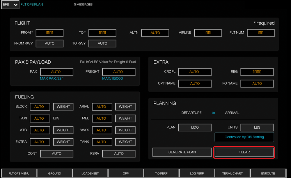 We're excited to unveil deeper SimBrief integration in the iniBuilds A350 directly within the OIS (Onboard Information System). Say goodbye to switching between apps and windows — now you can plan your entire flight, from departure to arrival, right from the cockpit using the new FLT OPS PLAN page! Accessing the Planner The new planner has its own dedicated page which can be reached via FLT OPS MENU > FLT OPLS PLAN. (Click to enlarge image) Creating a SimBrief Flightplan via the Planner In order to create your flight plan, only the following fields are mandatory FROM* - Input your Departure airport's 4-letter ICAO code here (e.g. LPFR) TO* - Input your Arrival airport's 4-letter ICAO code here (e.g. EGLL) Then, press the GENERATE PLAN button to create a SimBrief Flightplan using the default "AUTO" values. (Click to enlarge image) For additional customization, you can also tweak the below fields which are optional ALTN - Input your Alternate airport's 4-letter ICAO code here (e.g. EGCC). Default value is AUTO. AIRLINE - Input any 3-letter ICAO airline code (e.g. BAW) FLT NUM - Input any alpha-numeric flight numer (e.g. 25A) FROM RWY - Select your Departure airport's desired runway. Default value is AUTO. TO RWY - Select your Arrival airport's desired runway. Default value is AUTO. PAX - Input the number of desired passengers. Values exceeding the MAX will use MAX instead. Default value is AUTO. FREIGHT - Input the desired weight (KG/LBS) of cargo. Values exceeding the MAX will use MAX instead. Default value is AUTO. CRZ FL - Enter your desired Cruise altitude in 3-digit flight levels (e.g. 380 for 38,000ft). Default value is AUTO. REG - Enter your desired aircraft registration. Default value is autofilled from the ATC ID field of aircraft.cfg. CPT NAME - Input custom Captain's Name on the OFP. Default value is AUTO. FO NAME - Input custom First Officer's Name on the OFP. Default value is AUTO. PLAN - Choose the desired OFP format from the list that shows on screen. Default value is LIDO. FUELING section - Choose between WEIGHT or MIN units and enter the desired numeric value for that particular fuel section on your OFP. Default value is AUTO. To reset the page back to its default state, click the CLEAR button. (Click to enlarge image) To change the planning units between KG/LBS, change the Aircraft Weight Units from the OIS Settings page. (Click to enlarge image) Using your New Flightplan - OFP Once you have successfully generated a flight plan, the OIS will automatically go to the OFP page and give you a 'PLAN GENERATED SUCCESSFULLY' notification at the top of the screen. That's it! Your new flightplan is now active on SimBrief, same as if you had generated via their Dispatcher Tool or Website. Now you may use this new plan on the FLT OPS STATUS, LOADSHEET, TO PERF or LDG PERF pages of the OIS by Importing or syncing with Simbrief as usual. You may also request your new flightplan on the FMS via the CPNY F-PLN REQUEST button on the INIT Page. For more information please see the following guides: