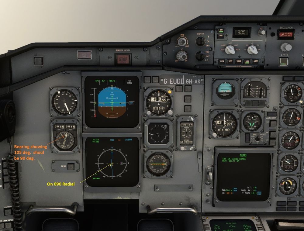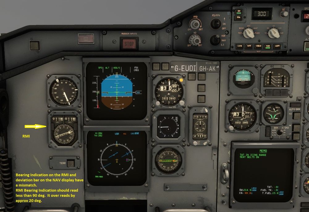 The ADF and VOR indications on the Radio Magnetic Indicators (RMI) are not pointing correctly towards the ground transmitters. In the case of VOR, there is an error between the RMI indications and the NAV display deviation bar. This makes tracking a VOR radial difficult. I compared the situation with A320 and A320 shows absolutely correct indications. It would be very helpful if this is corrected. Thanks.