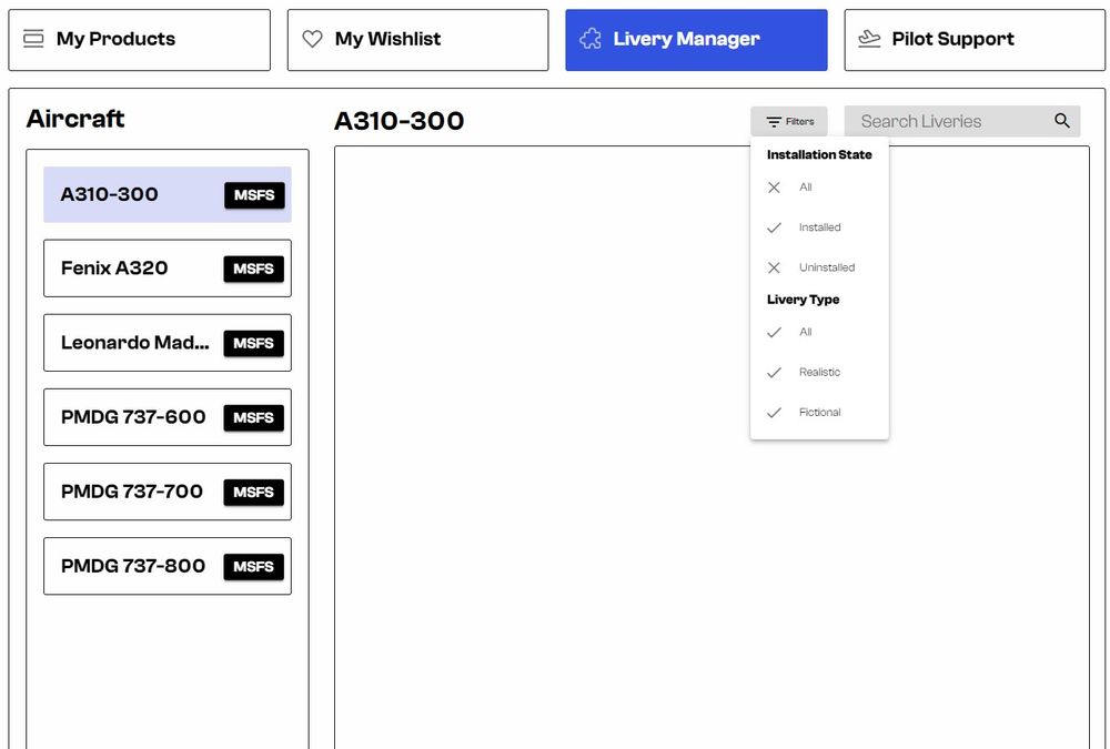 At the moment I have 4 A310-300 liveries installed. When I log out of iniManager the liveries do not appear as installed when I log in again. I have reinstalled the liveries and then they appear as installed when logged in, but as stated above this does not appear once logged out.