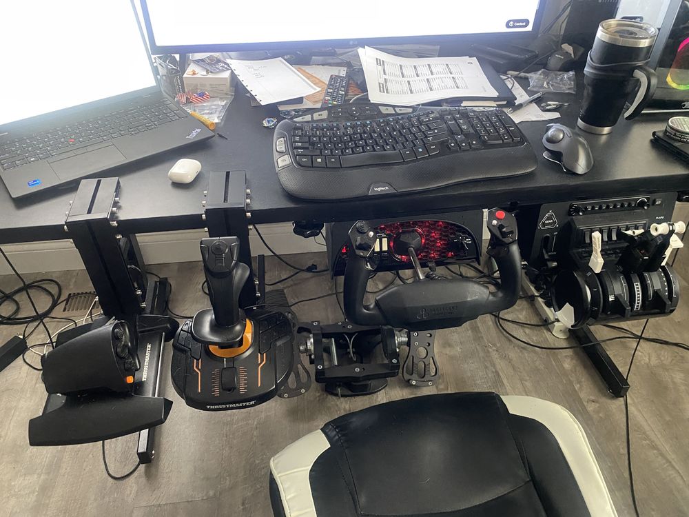 Besides what I listed, I have the T16000 joystick and throttle quadrant. The joystick I use for Airbus ops that have a sidestick. I use the paddle on the back of the TQ for my tiller on all aircraft. Ignore mess on my desk as I am in full work mode at this time.