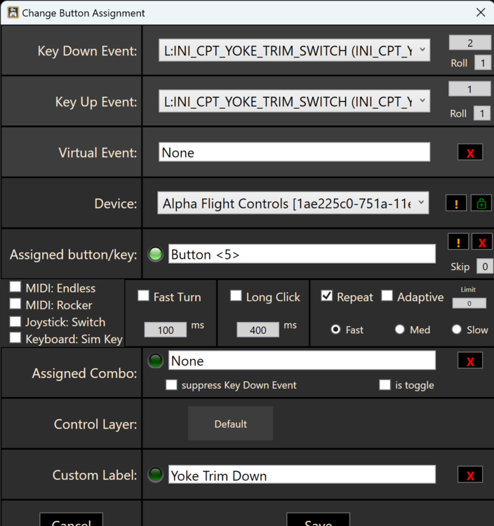 I see the same thing here are my bindings through AAO. I have experimented with Repeat on/off and on with FAST, MED and Slow. This is set to my trim button on my HC Alpha yoke (left horn)
