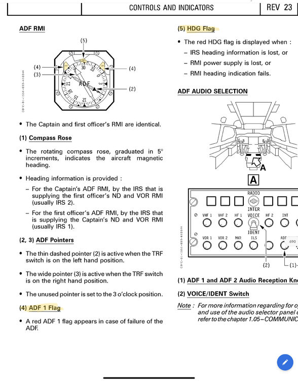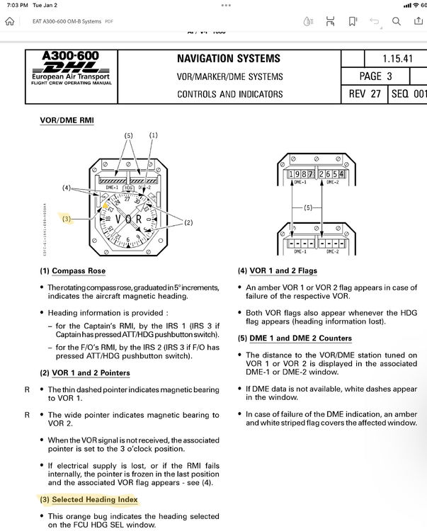 11. On the RMI, the Selected Heading Index is INOP. It is modeled, but it is always at the 12 o’clock position. It should move with the HDG select knob on the FCU panel (except when unpowered).