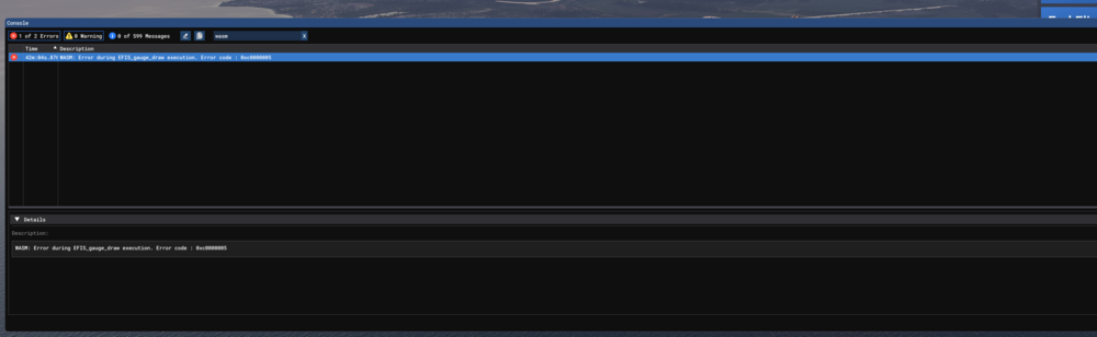 2. I had a WASM crash during takeoff from TJSJ (I also had one right before this at the gate, but didn't go into dev mode before restarting the flight). To reproduce: Takeoff? I don't know.. I didn't really do anything besides go full throttle and liftoff- I certainly didn't click any buttons at all besides raising the gear with my Thrustmaster Airbus Throttle. The WASM crash that happened prior to this at the gate happened when I clicked the "FMS 1" selection in the top left corner of the FMS and I reselected "FMS 1". Info: Inibuilds A350-900 MSFS 2024 Navigraph Intel i9-13900k, RTX5090, 64gb DDR5 Ram WASM: Error during EFIS_gauge_draw execution. Error code: 0xc0000005 I don't have any "auto saves".