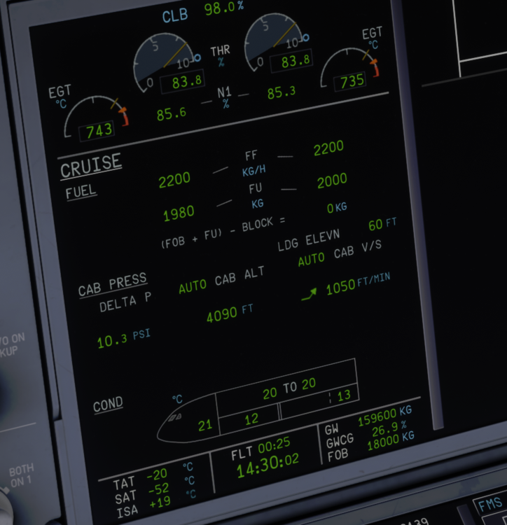 First of all what a great release. Smooth sailing congrats to the team! Just leveled off at FL430 to find my cabin altitude going absolutely haywire. It'll climb and decent almost 5000ft/min alternating between the cabin climbing and decending. Also I feel like the EGTs are pretty high and the fuel calculation FOB+FU seems to be INOP. Apart from these, no major hiccups found so far. Performance has been stunning!