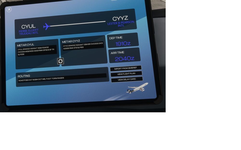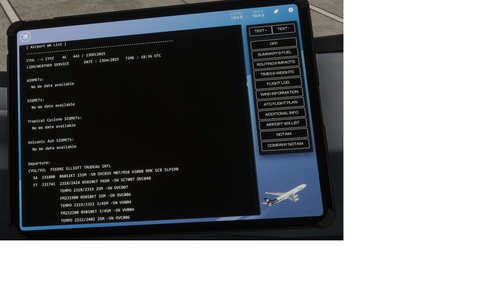 2. Hi, Just purchase the A340 what a wonderful aircraft. I was configuring for my first departure (CYUL) and I notice that the Pressure and wind direction and speed was different in the EFB (the metar for CYUL indicate 03010KT, pressure 30.21 (1023)) in my flight option screen, but on Active Sky it was showing (60 @ 11 kts true, pressure 1019) . see attach picture My Flight screen My Active Sky screen I also check my OPS plan from Simbrief using the View Flightplan option and as you can see the weather info is simular as Active Sky and not with My Flight. When I upload the weather info in the takeoff option screen in the EFB it loaded the wrong info, the one in the My Flight option. So where does the A340 EFB takes is weather info? Is this simply a missing options choice on my side? Pierre