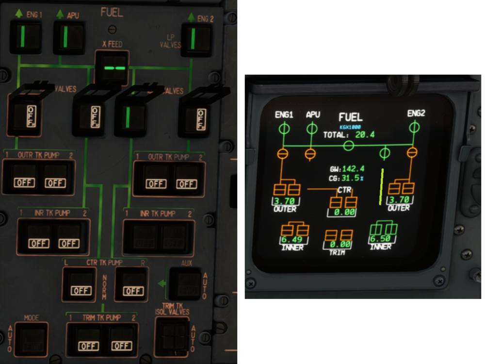Just for curiosity I decided to draw fuel only from inner right tank, so I closed the outer valve. The green light showing INNER fuel line is not being drawn, despite the fact the system are working properly. Just a cosmetic bug. BTW I draw the partial green line.