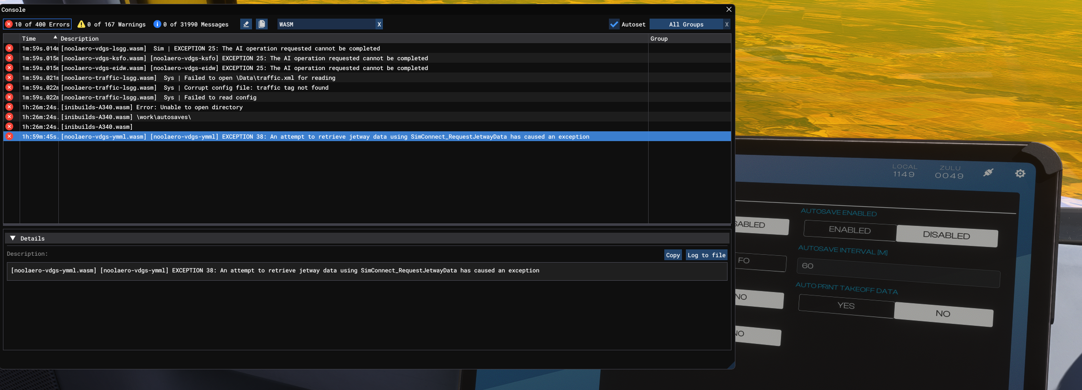 Got a WASM crash exactly at exactly 30 minutes on the chrono (related maybe idk). Autosave has never been enabled, no folder exsists, EFB says autosave interval (M) is 60. Clock remained ticking after WASM crash.