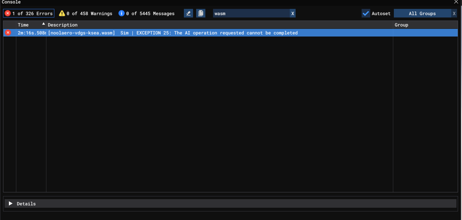[noolaero-vdgs-ksea.wasm] Sim | EXCEPTION 25: The AI operation requested cannot be completed EIS1 Simulator: FS2024 Navdata Method: NAVIGRAPH Specs: i7 10700k, 4070 Ti Super, 32GB of RAM no dicernible action that precipitated the crash. AC was climbing along the SID, last action was setting altimeters to standard (crash didnt happeb immediately afterwards)