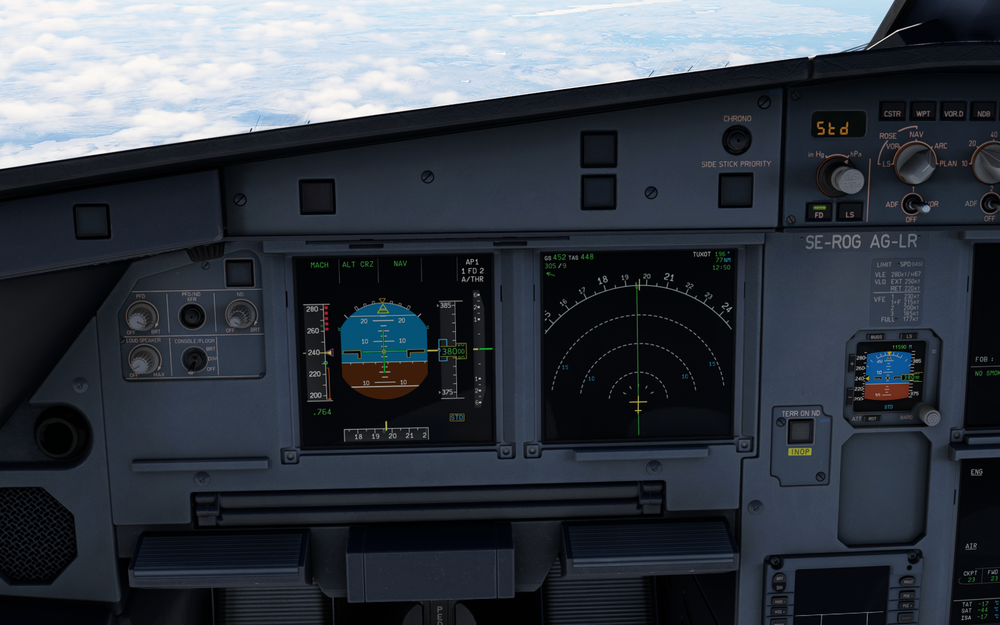 Just as a reference, here is a screenshot from the flightdeck on an A320neo during cruise. It appears to be flying faster (Mach .78 versus Mach .76) nevertheless the difference in the pitch up angle is evident. In the real-world screenshot the pitch up attitude looks like close to 2.5 degrees nose-up attitude.