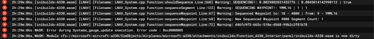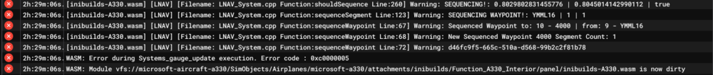 1. WASM Crash on final approach into Orbx YMML on ILS Z 16 During final approach the WASM crashed on the A330-200 GE Pax, no systems worked after that point, reverse thrust, spoilers, flap retraction, etc. To Reproduce, Fly the final approach into YMML Rwy 16 ILS Z Aircraft: A330-200 GE Passenger Simulator: FS2024 Version: MSFS 1.6.34.0 Navdata Method: NAVIGRAPH OFP: Include a PDF of your Operational Flightplan (OFP) if related to FMS/Route Procedures crashes WASM Error: Error during Systems_gauge_update execution. Error code : 0xc0000005 Specs: CPU (Ryzen 7 3700X), GPU (GeForce RTX 3060) and RAM (32GB) YSSYYMML_PDF_1772857150.25c1e5f3.pdf