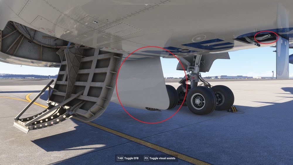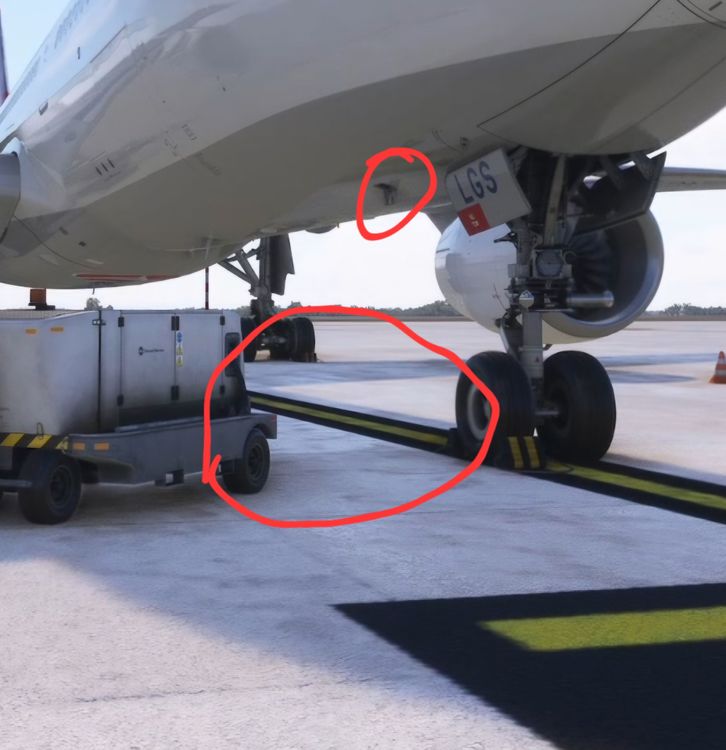 I'm not sure if it was like this in previous versions, but I noticed it too. Ground power is connected to the aircraft, but when it's off, the cable is not visible. It should normally be visible. If we turn it on, the cable becomes visible. If you look at the photo below, you'll see that ground power is in the off position, and the aircraft's ground power hatch is open, but the cable is missing.