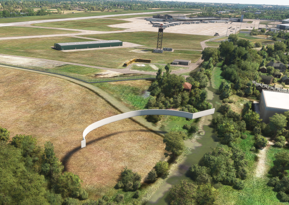 There is a large white floating object (looks like a wall or part of a building) just above the treeline on the right hand side of Runway 08's threshold.