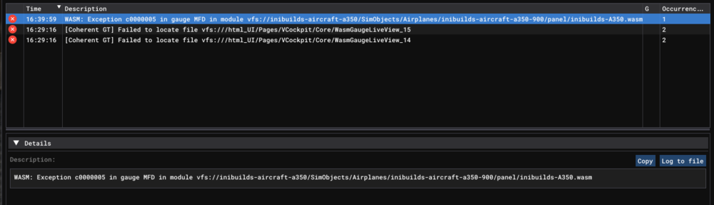 5. Almost immediately after loading flight plan from LSZH to PHNL (after requesting it) WASM crashes. It does not happen with any other flight from LSZH or to PHNL (LKPR to PHNL works fine for example). To reproduce Load at LSZH Power on aircraft (Battery, GPU) Click INIT Request company flight plan Load company flight plan Systems freeze Information Aircraft: A350-900 & A350-1000 Simulator: FS2020 Navdata Method: NAVIGRAPH OFP: Any flight plan from LSZH to PHNL (seemes to happen even when I selected another route) Route: DEGES3S DEGES Z1 SUDEN/N0502F340 DCT LBU N851 RIMKI Z99 ELNAT P605 HAM M852 ALASA/N0508F330 M852 ALS P615 NEDZA/N0500F340 DCT GIMEX/N0500F330 M609 NONVU M604 OMEXA/N0490F350 M604 INPAR/M084F340 DCT 89N000W/N0500F360 85N120W 80N134W 72N140W/N0494F370 DCT ADREW/N0494F380 J160 AYKID/N0483F370 J160 FAI J115 BGQ/N0481F390 J115 TED/N0480F380 J125 ODK/N0485F390 DCT 55N153W 50N154W 45N155W 40N156W 37N156W 30N157W/N0481F410 DCT ZIGIE INOYI1 Specs: RTX4070Ti, i7-12700K, 64GB RAM WASM: Exception c0000005 in gauge MFD in module vfs://inibuilds-aircraft-a350/SimObjects/Airplanes/inibuilds-aircraft-a350-900/panel/inibuilds-A350.wasm