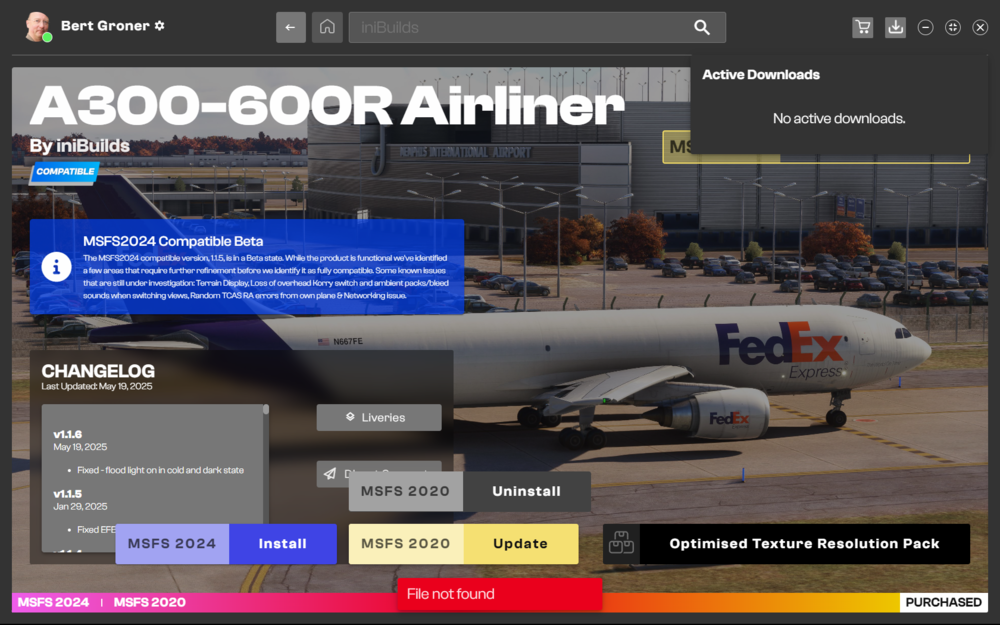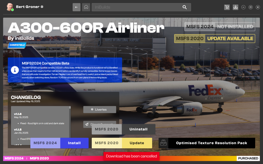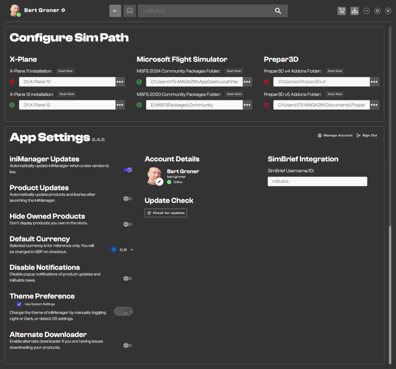 Helo Eddie! Thanks for your response... I attach a screenshot of my current settings with iniManager. I've just changed the "Alternate Downloader" switch with the settings. After this the download doesn't work as well but this this time with the report "Download has been cancelt". Maybe this is important: This happens only while trying tp update the A300-600 for MSFS. All other add ons are fine. Cheers! Bert
