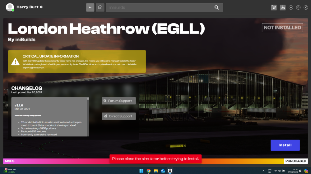 I am trying to install Sceneries however I am getting a "Please close the simulator before trying to install." error but I do not have the simulator open, and have restarted my PC etc.