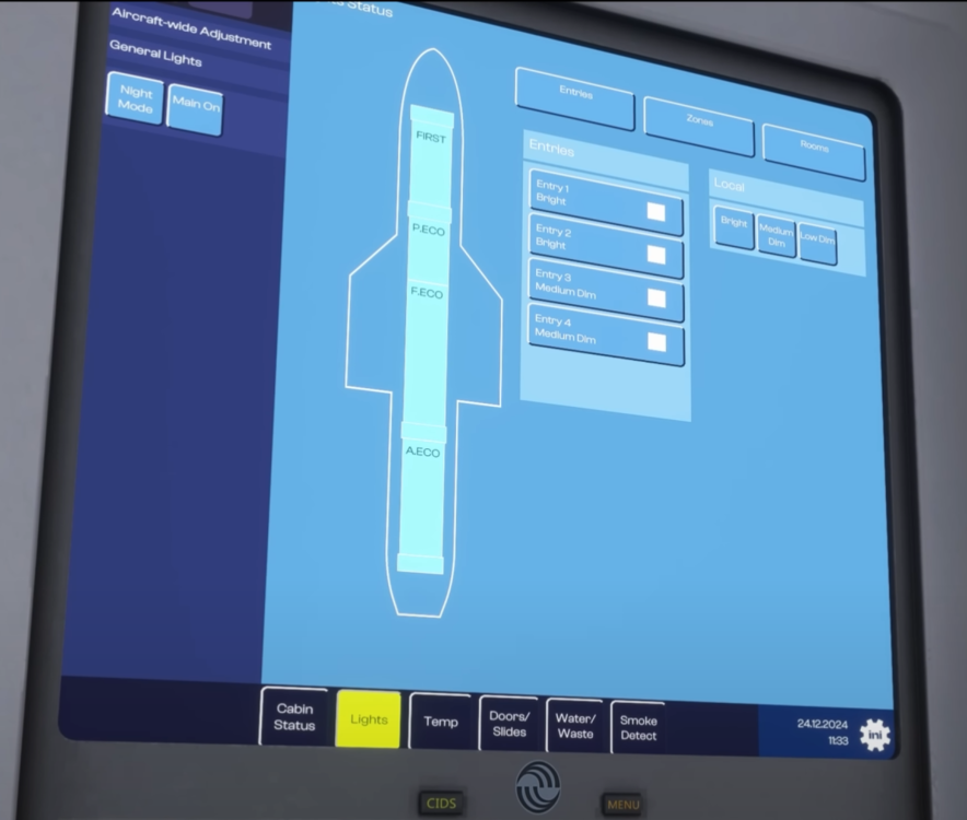 Hello, Yes. You can control the lighting amongst other things using the flight attendant panel as seen in that trailer: