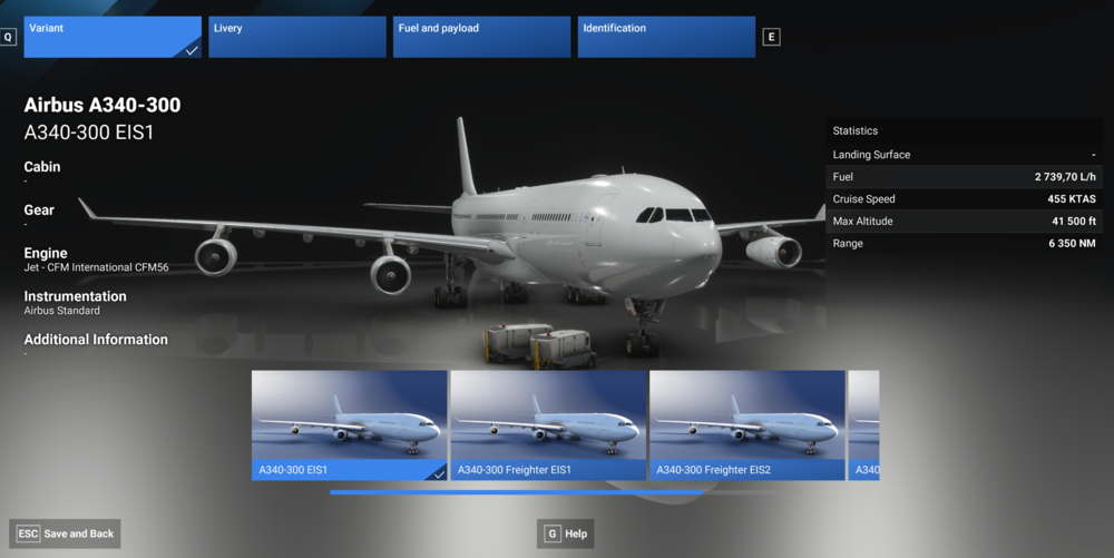 Overview The iniBuilds A340 Airliner comes with the option to use the Electronic Instrument System 1 & 2 (EIS 1 & 2) variant of the aircraft as well as a Preighter (cargo in cabin) version. Changing Variants Open the Aircraft Selection Menu Find from the list or Search for the 'A340' Select 'Configure' at the bottom left corner of your screen via your mouse or by pressing the shown keybind Choose the 'Variant' tab at the top Select 'A340-300 (EIS1)', 'A340-300 (Freighter EIS1)', 'A340-300 (EIS2)' or 'A340-300 (Freighter EIS2)'. Switch to the 'Livery' tab at the top Choose your desired livery from the list Select 'Save and Back' at the bottom left corner of your screen via your mouse or by pressing the shown keybind Now you can return to the Free Flight menu and Start Flight to use the selected variant of the iniBuilds A340 Airliner.
