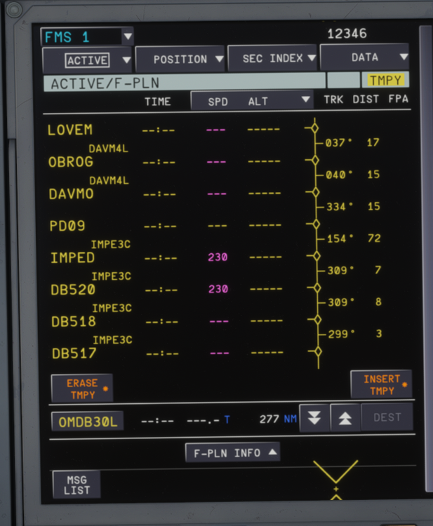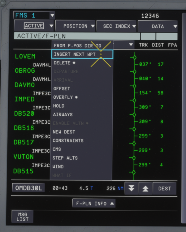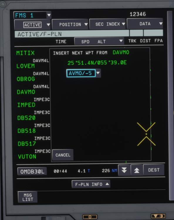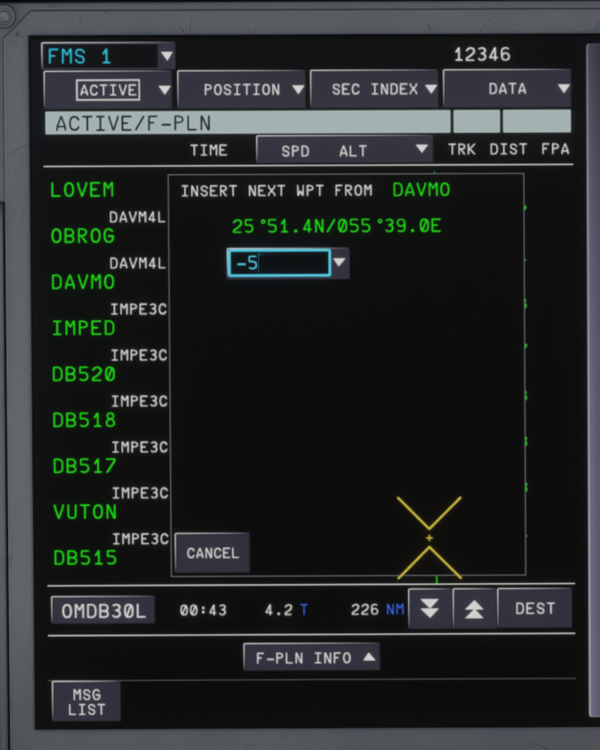 o Type + or – and the distance that you want .i.e. -10 or +15 (as long as there is enough distance either before (for - ) or after ( for +) and the waypoints in the FM it will work same for