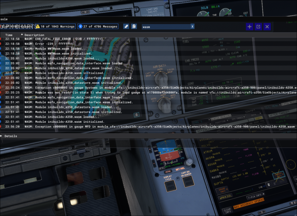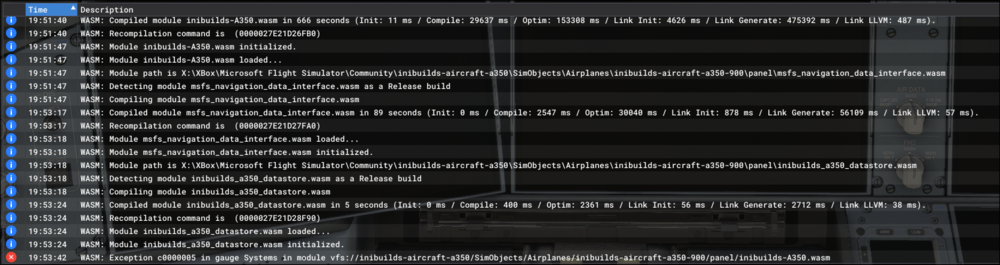 WASM Error: WASM Error: WASM: Exception c0000005 in gauge MFD in module vfs://inibuilds-aircraft-a350/SimObjects/Airplanes/inibuilds-aircraft-a350-900/panel/inibuilds-A350.wasm