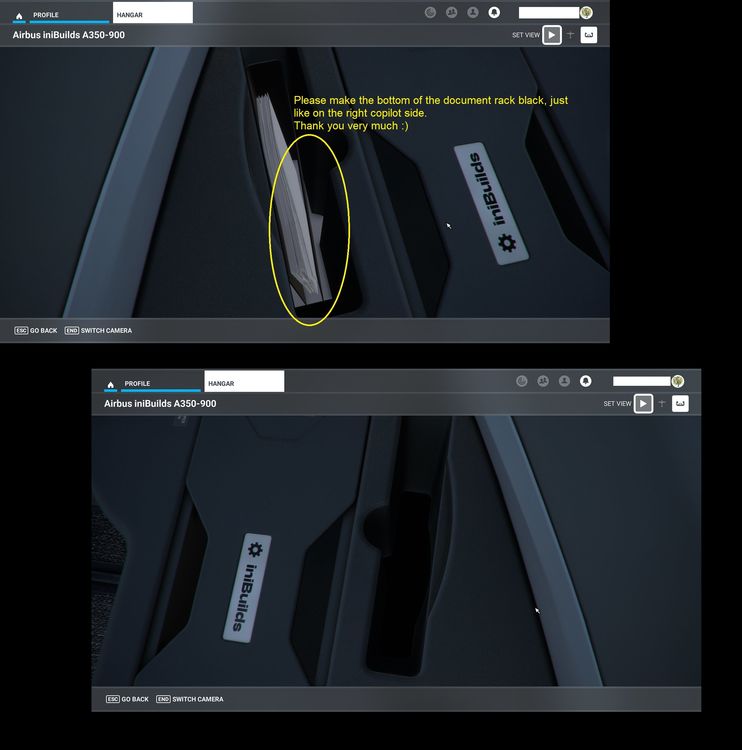 Greetings, I hope you all have great Easter holidays! 😊 I thought I should show up and destroy the good holiday mood and the awesome long weekend by reporting a bug list to have the developers work overtime during the whole weekend to fix all these bugs. Because I am evil muaharrharrharr... No just kidding, the A350 is still one of the most beautiful and greatest planes ever made, I just found this small texture glitch while looking around in the cockpit a bit during a long flight. Would be cool to see this white glitching out bottom texture of the pilot side document rack fixed, and after that the cockpit is A++ PERFECT! I could not find any other flaw or imperfection anymore inside the cockpit, and also none in the cockpit and navigation systems. One of the greatest and most flawless virtual planes ever!